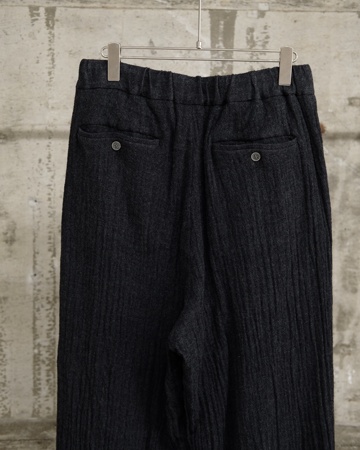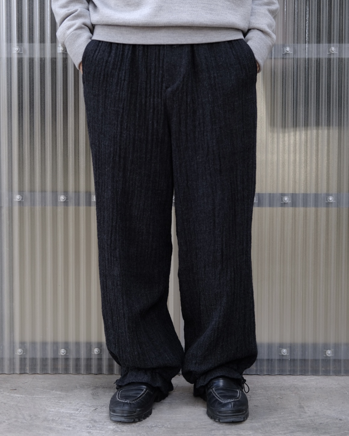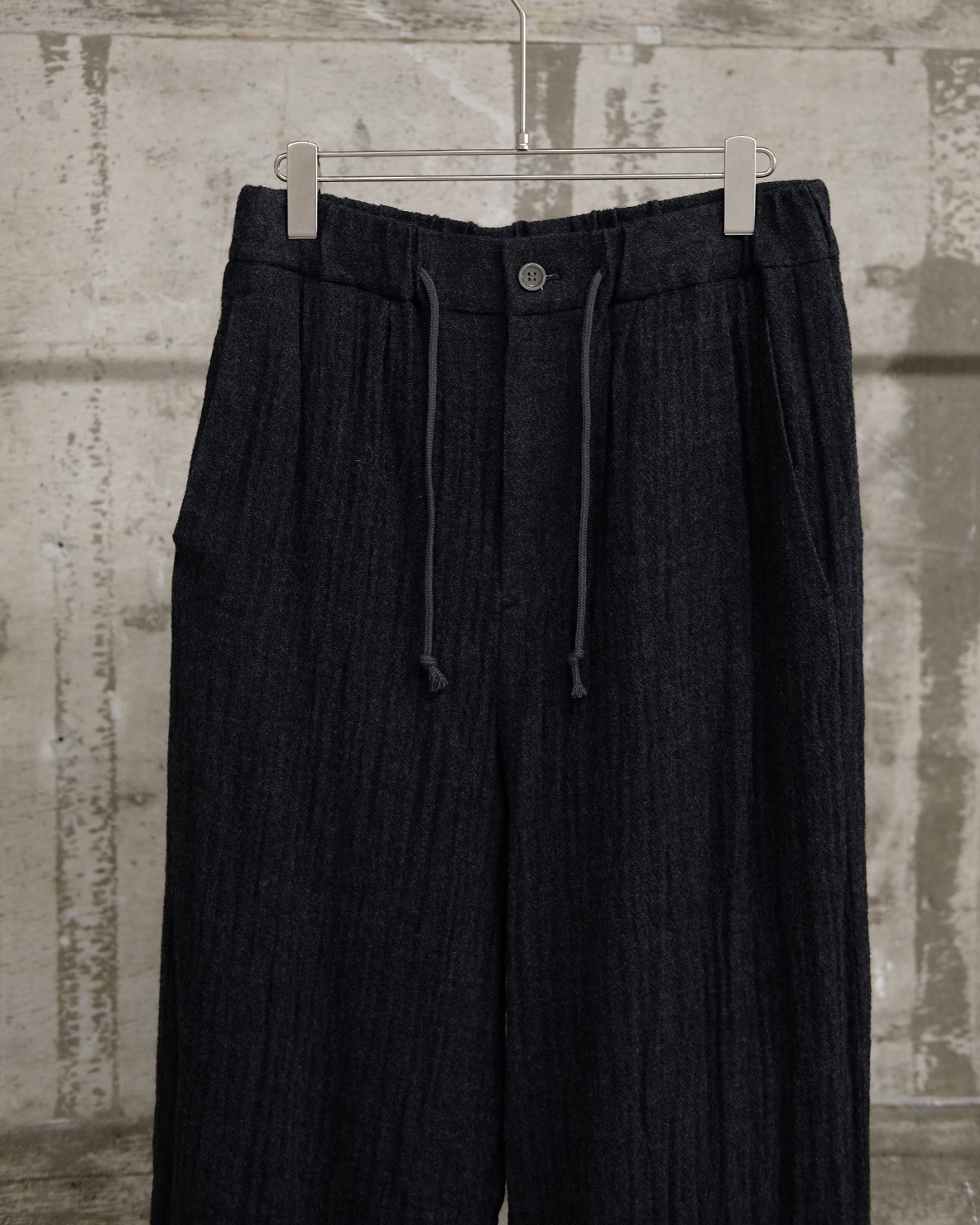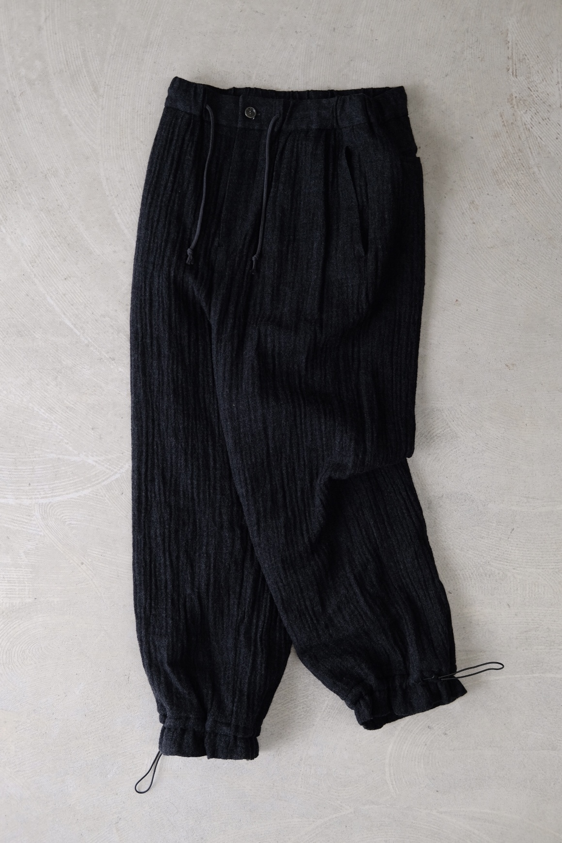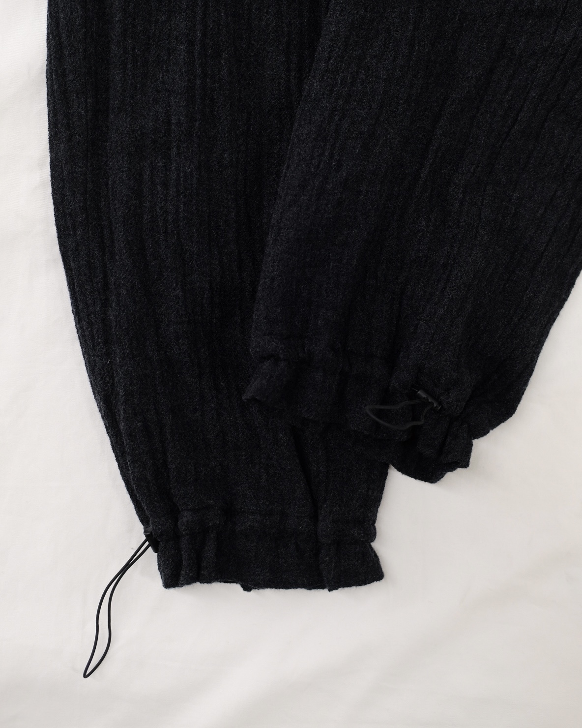 ワイドイージーパンツをベースに使用したトラックパンツ。裾線から少し上に通したスピンドルを絞った際、甘過ぎない程度に裾がフレアになるようにしています。