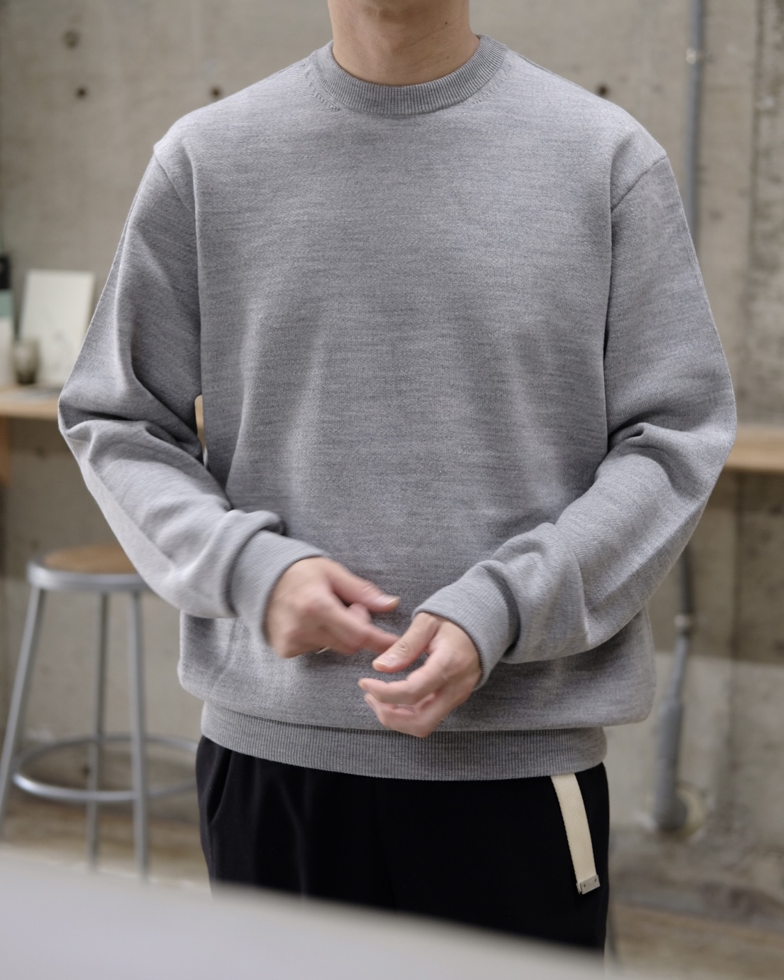 糸の本取りを表裏3本にしてヘビー裏毛のような肉感を出したクルーネックセーター。糸自体も杢を使用してセーターでありながら、スウェットのような表現をしています。