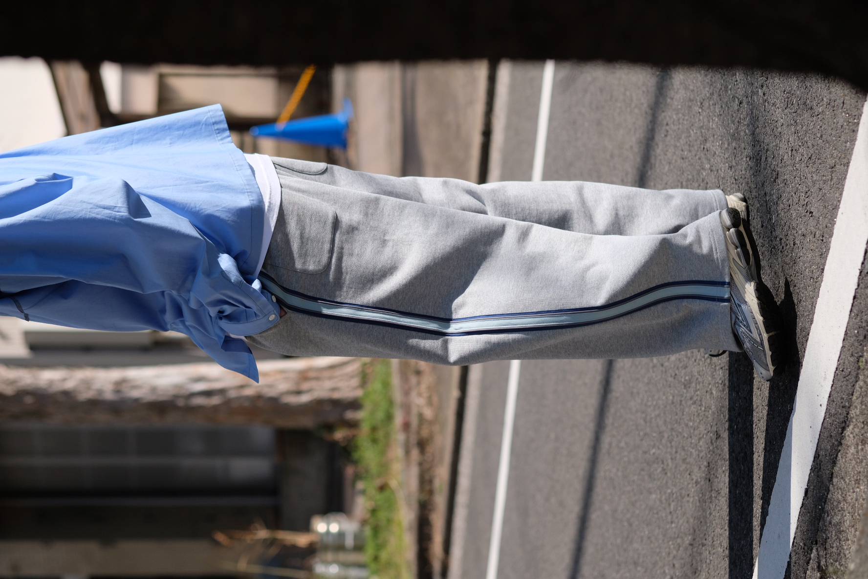 こちらは裾に特徴的なボリュームを持たせたワイドスウェットパンツにオリジナルデザインテープを側章風に配置しています。