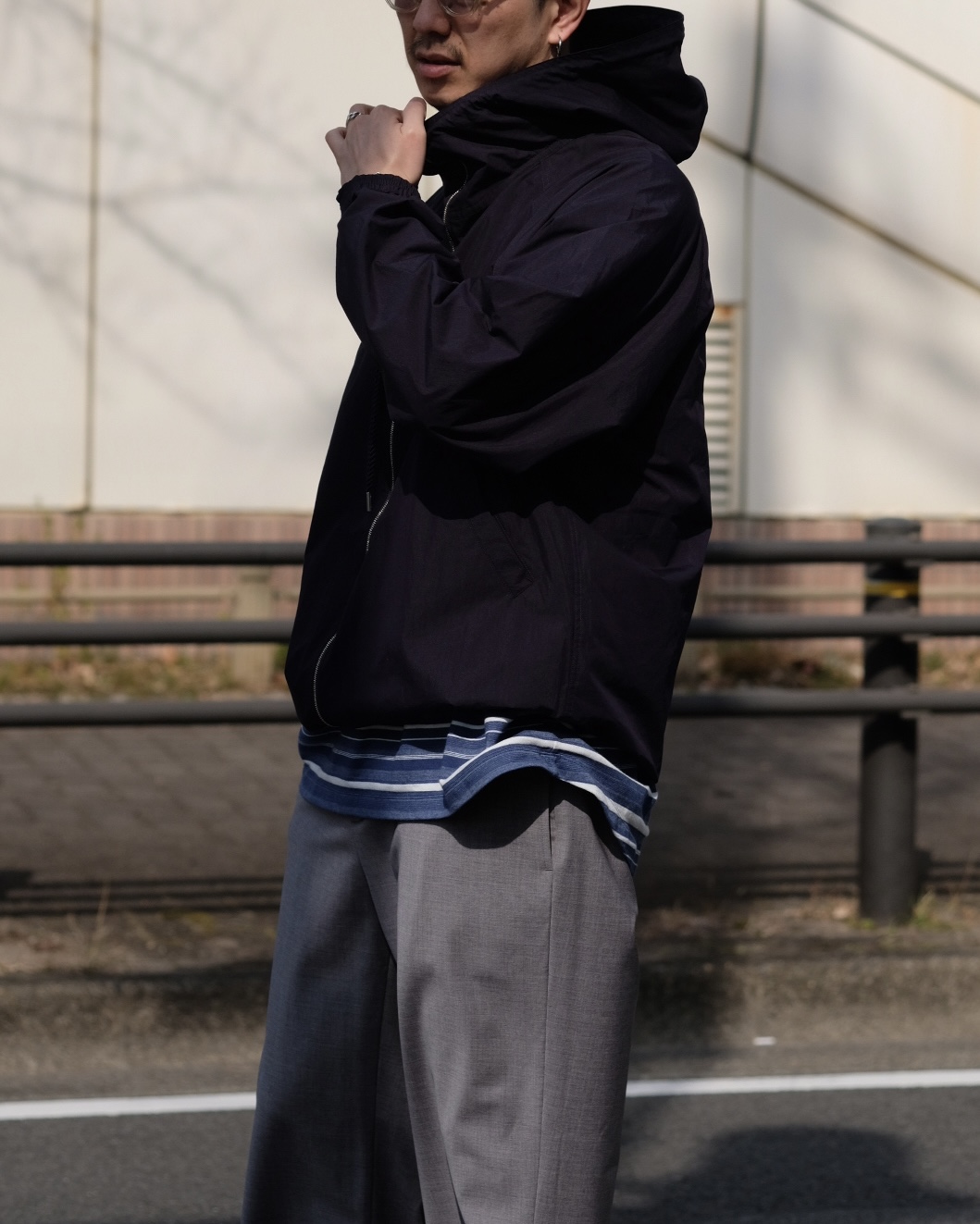こちらのマウンテンパーカーはコットンとリサイクルナイロンを高密度に織り上げて、ヨコ糸の色を変える事で奥行きのある表情に仕上げています。また繊細なシボ感とコットン100%のドローコードもFUJIらしいクリーンな印象に感じます。