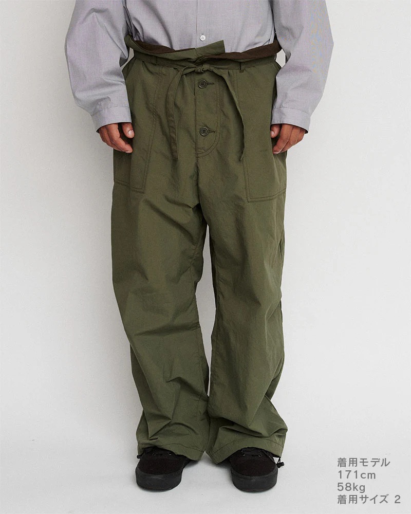 ハイウエストで大きく設定されたウエストを共布ベルトで締めるとパンツ端が反り返りベルト裏の別布が見えるよう設定したパンツ。