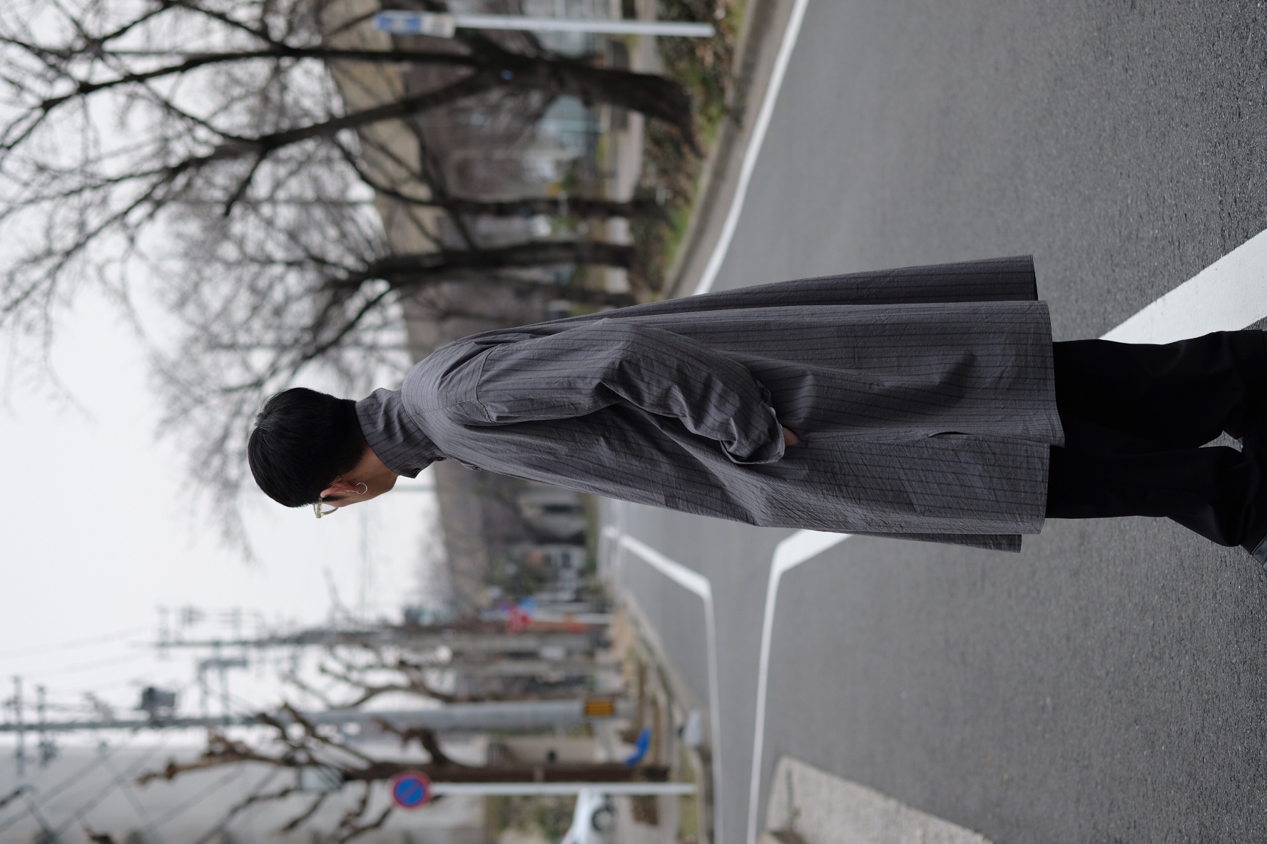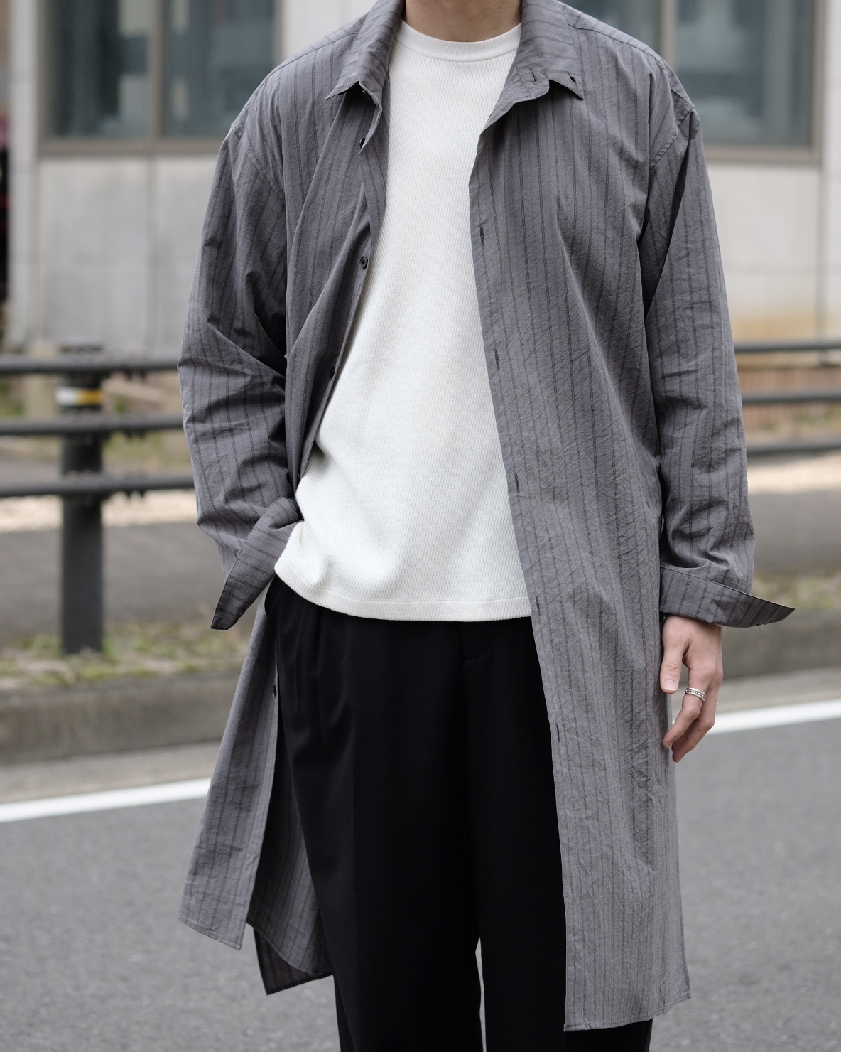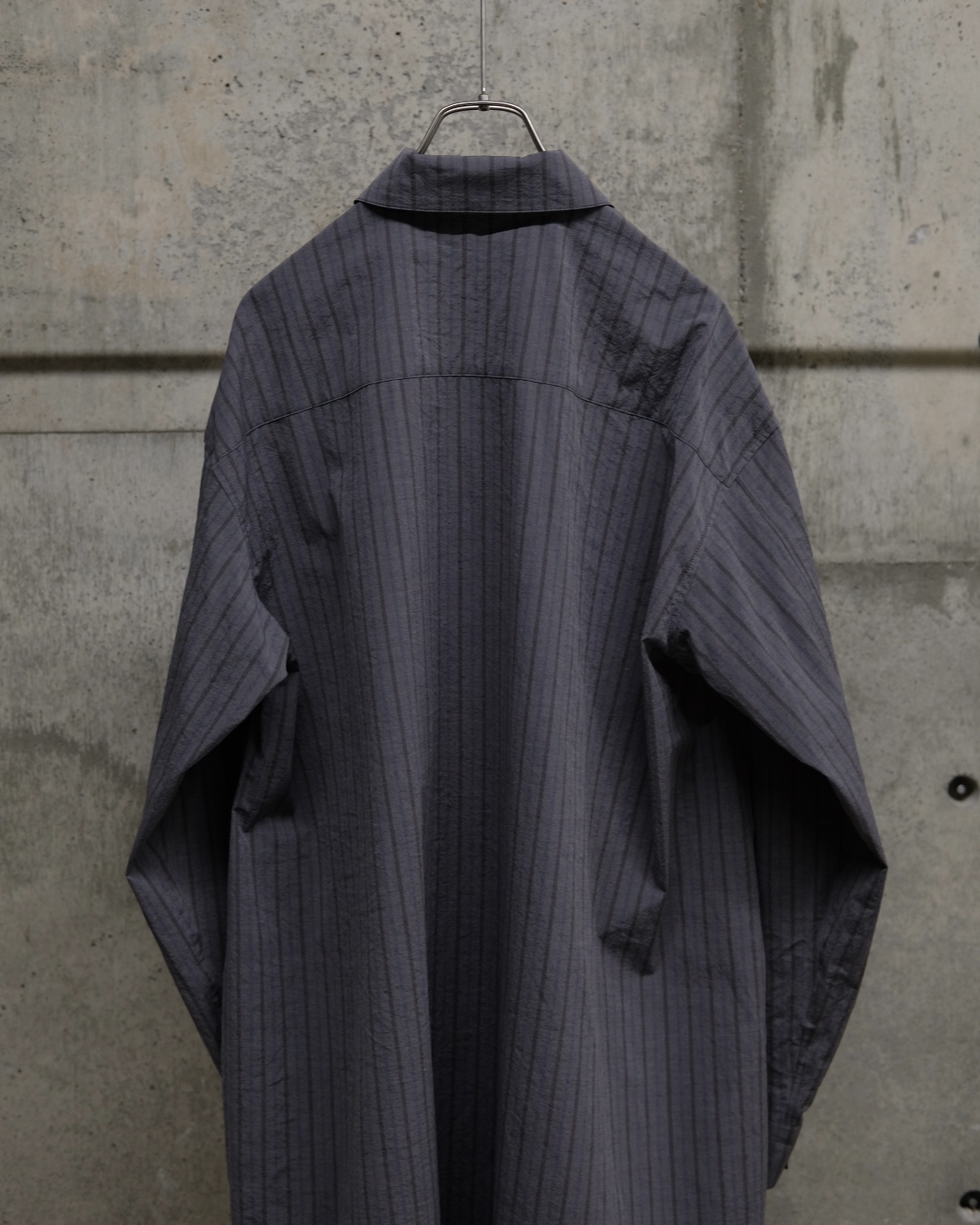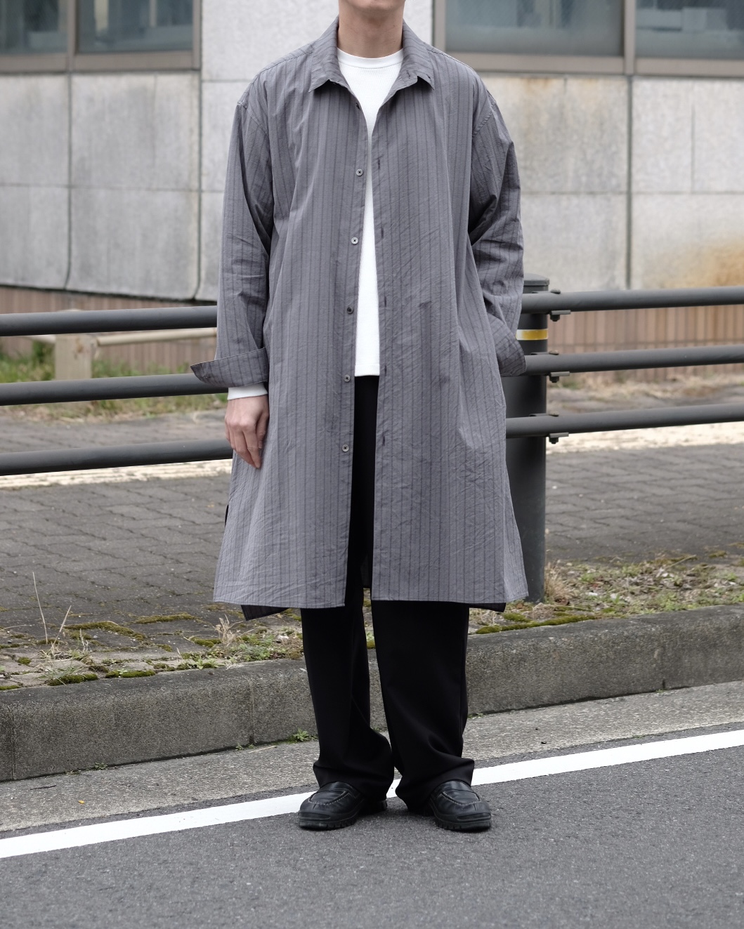 ドロップショルダーとサイドスリットで開放感のあるシルエットに仕上げられており、襟元にはボタンを配すことでスタンドカラーでも着用可能です。サイドポケットも付いており、シャツとしてだけでなく軽い羽織りとしても着られるこの春オススメのシャツコートです。