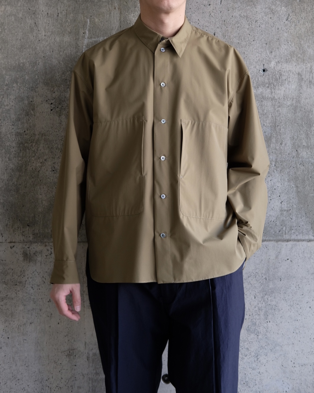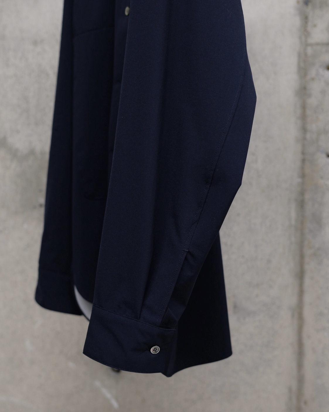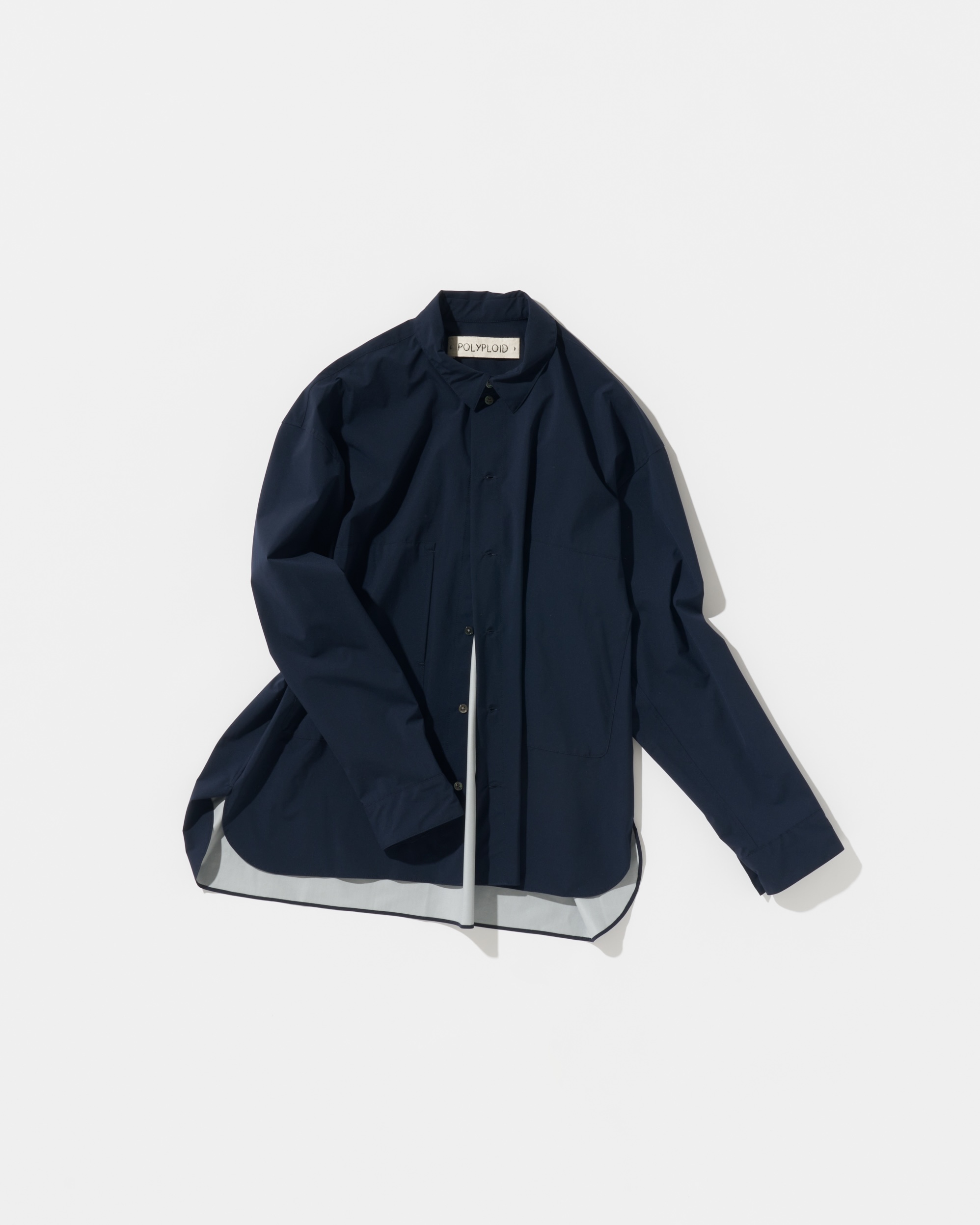 身頃に大胆に配置したサイドエントリー仕様の大きなフロントポケットやボタン位置・ボタンホールのスリットの向き、中心からずらした前立てなどさり気なくアウターのディテールを取り入れているのもポイント。ゆとりのあるシルエットで、シャツとしてだけでなくこれからの時期には軽いジャケットとして羽織っていただけます。