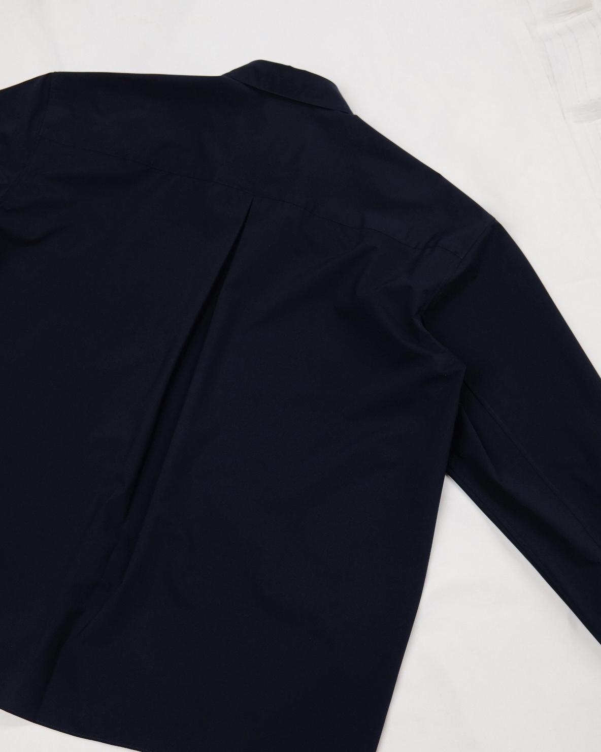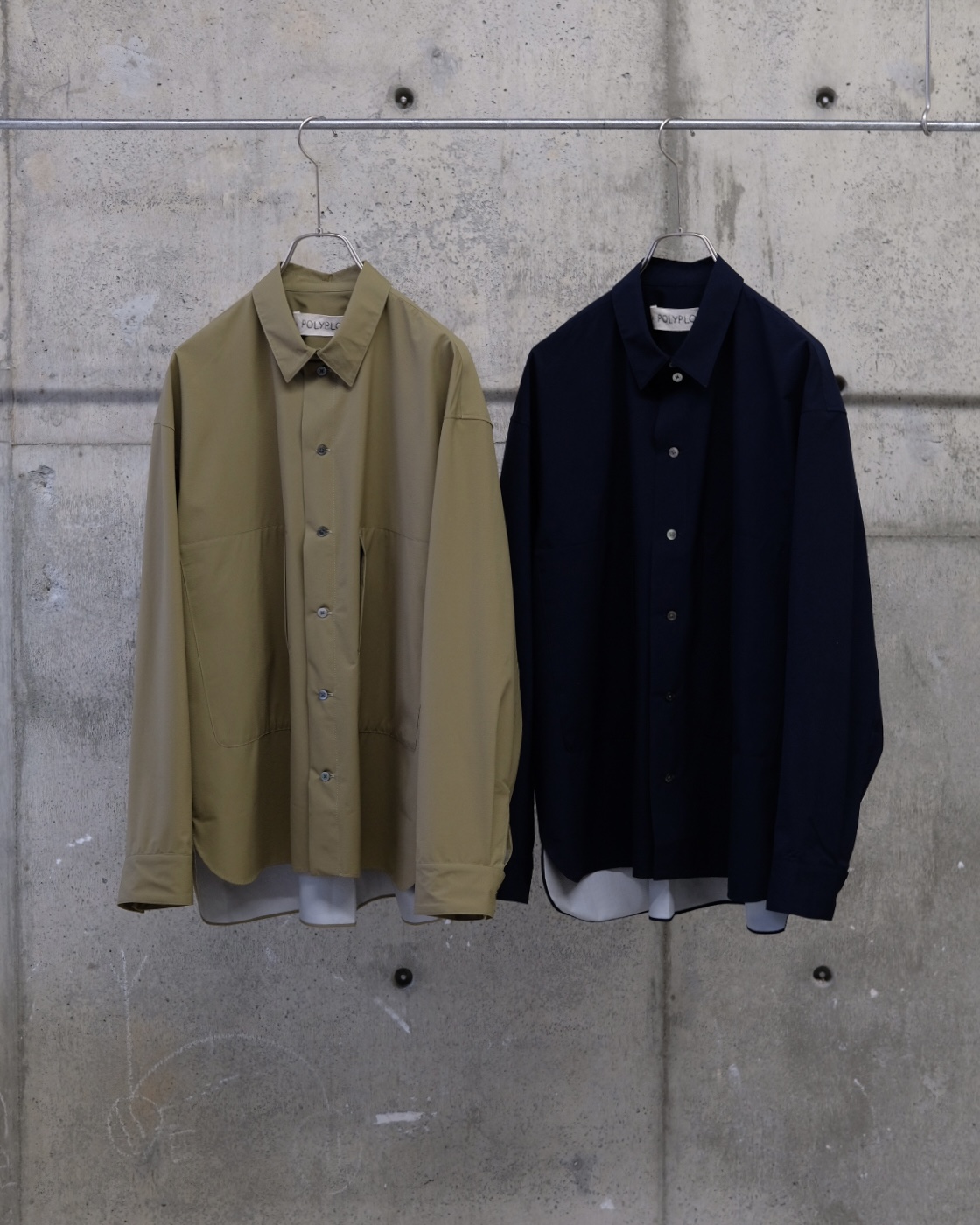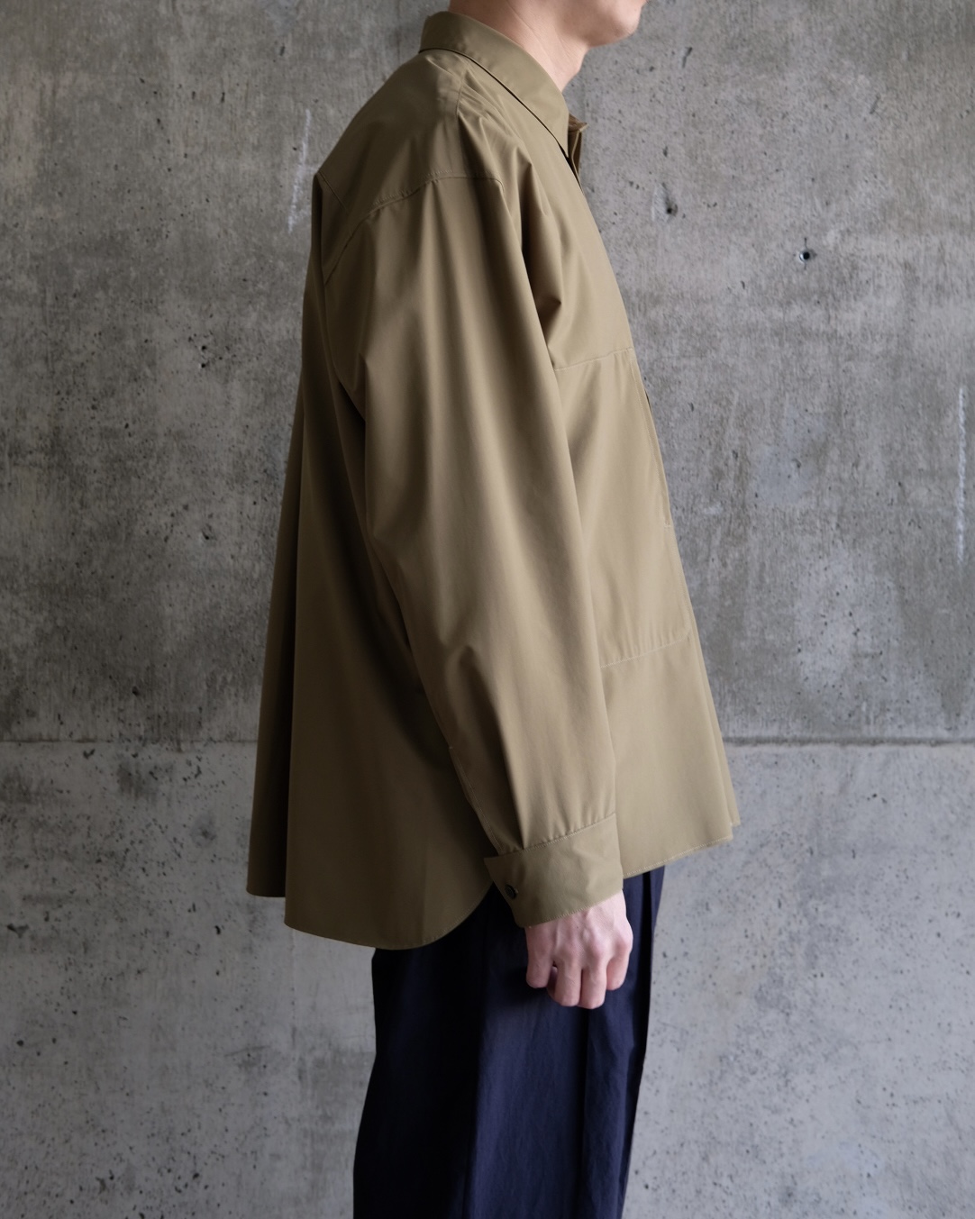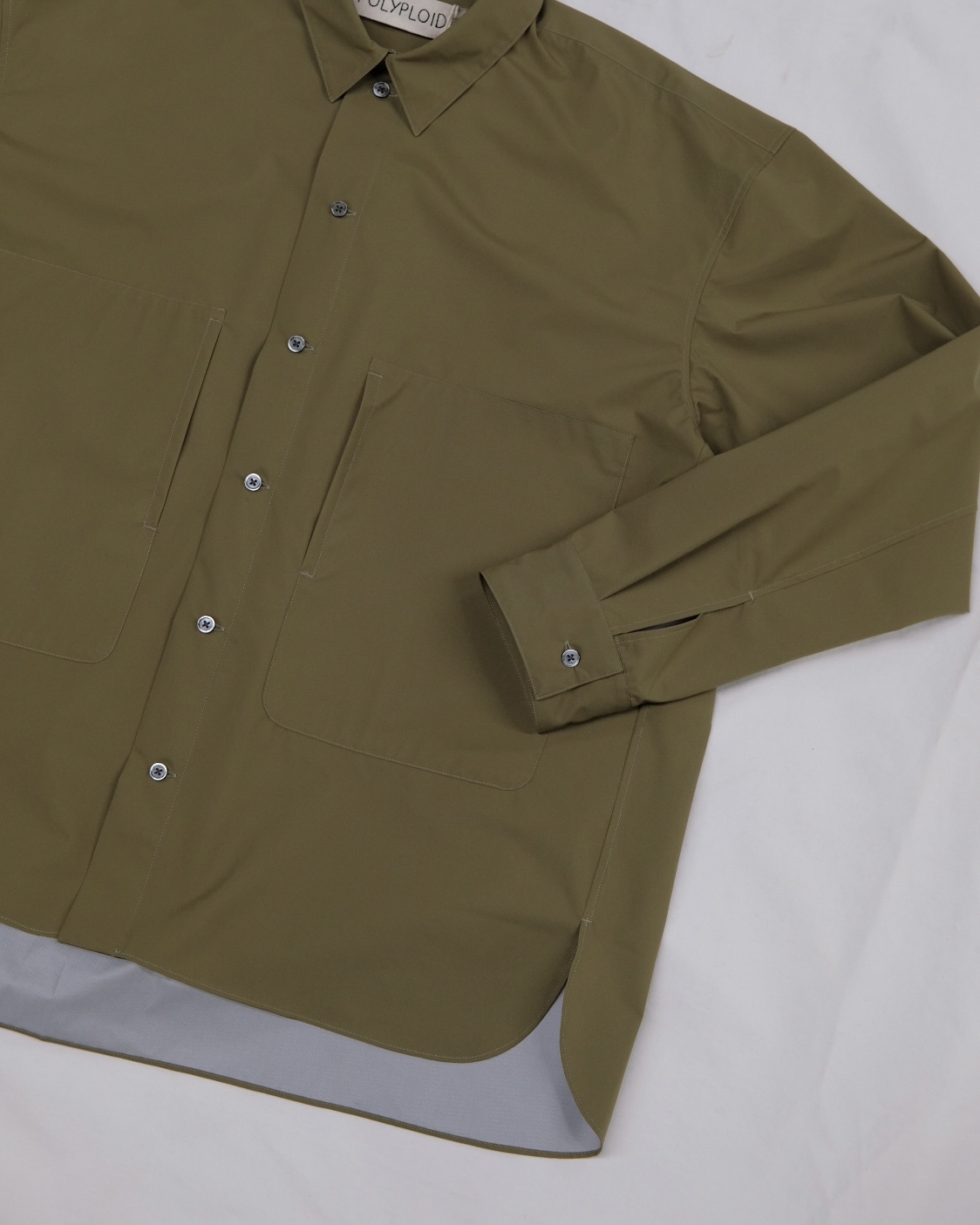 身頃に大胆に配置したサイドエントリー仕様の大きなフロントポケットやボタン位置・ボタンホールのスリットの向き、中心からずらした前立てなどさり気なくアウターのディテールを取り入れているのもポイント。ゆとりのあるシルエットで、シャツとしてだけでなくこれからの時期には軽いジャケットとして羽織っていただけます。