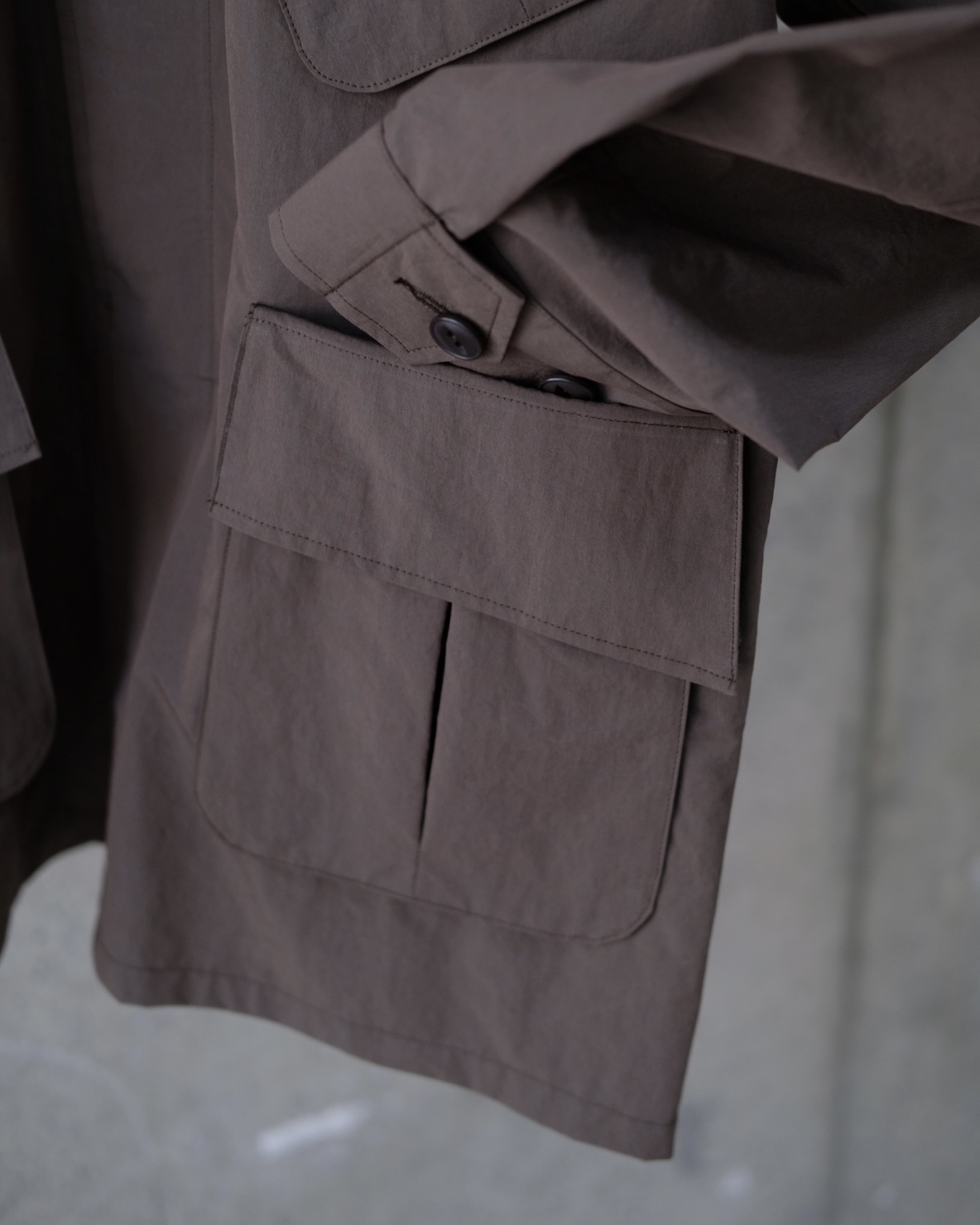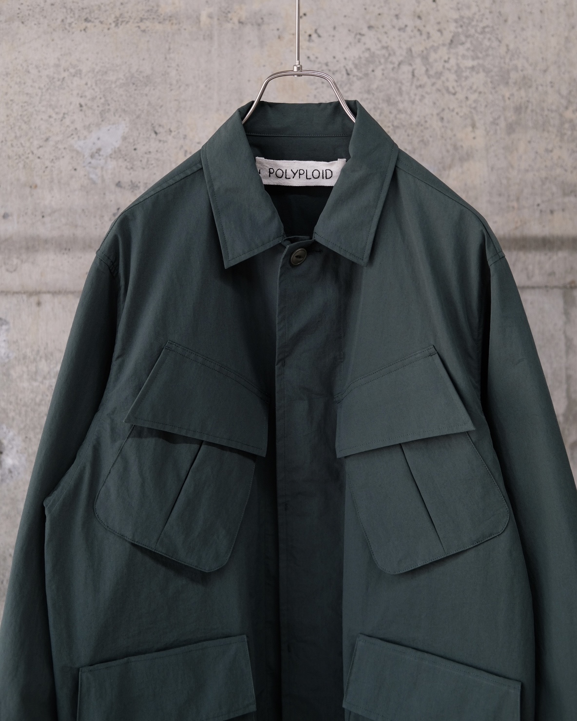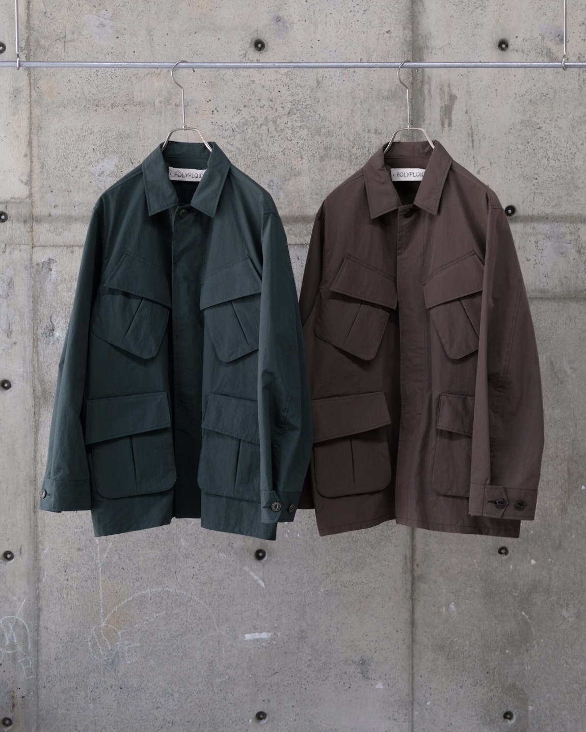 斜めに角度の付いた胸ポケットは残しながらエポレットは排除され、POLYPLOIDらしい色使いや素材使いによってクリーンな雰囲気にアレンジされています。