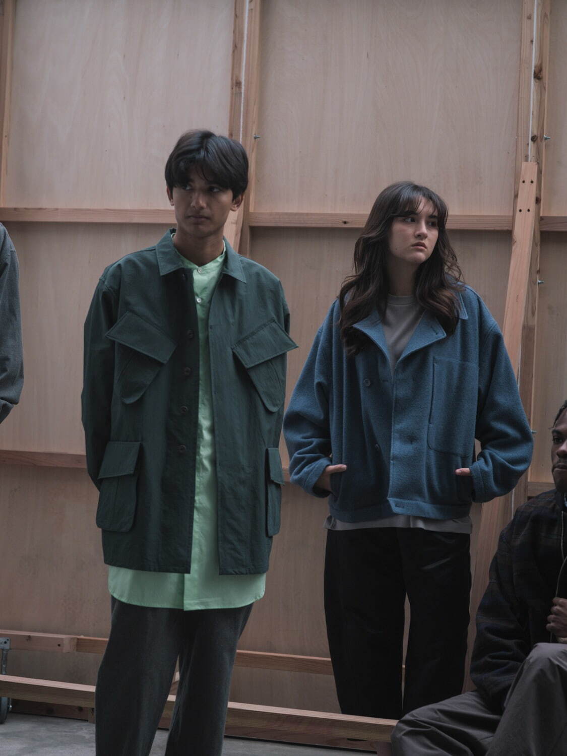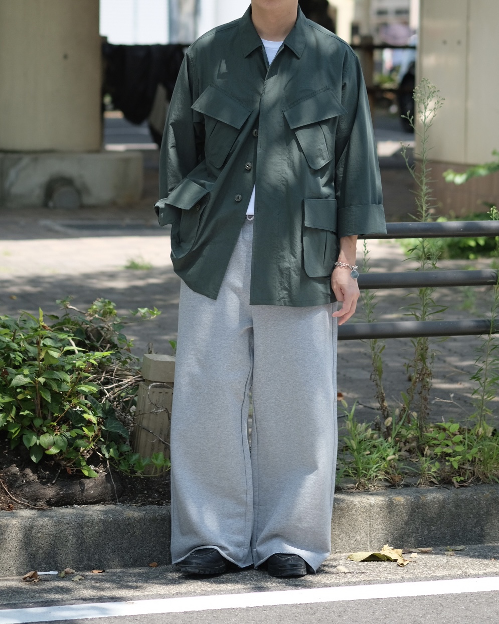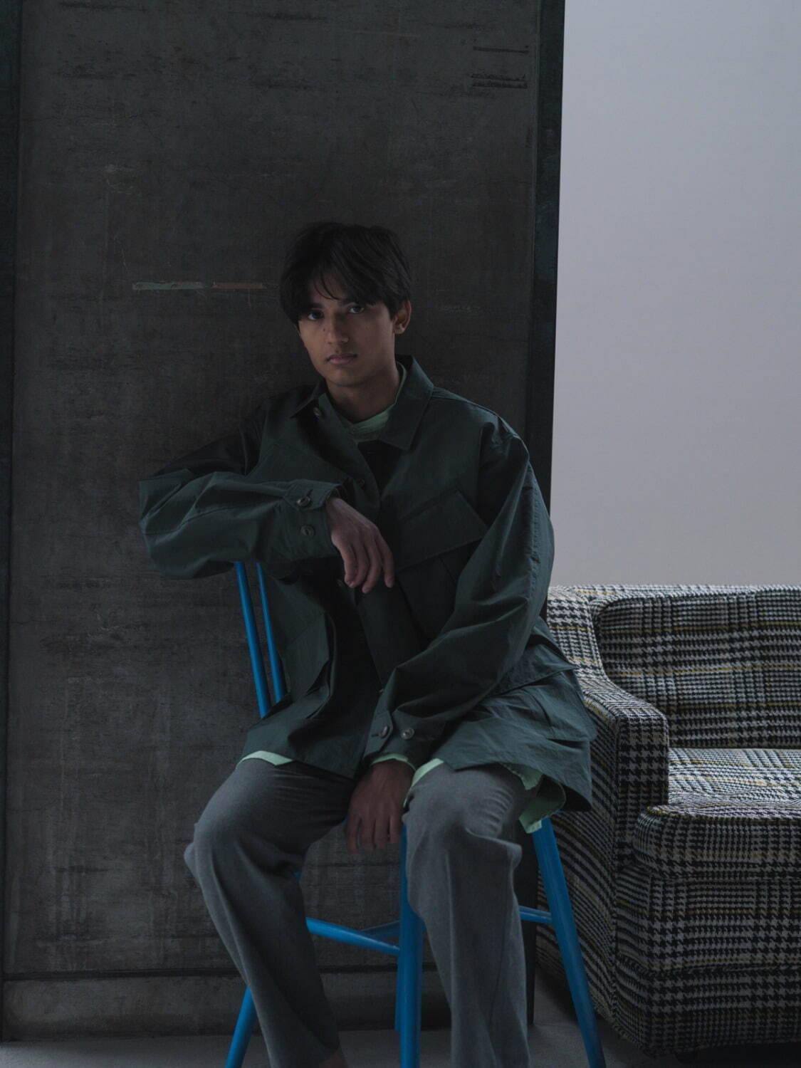 斜めに角度の付いた胸ポケットは残しながらエポレットは排除され、POLYPLOIDらしい色使いや素材使いによってクリーンな雰囲気にアレンジされています。