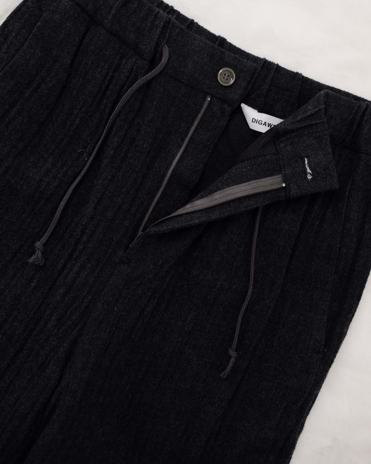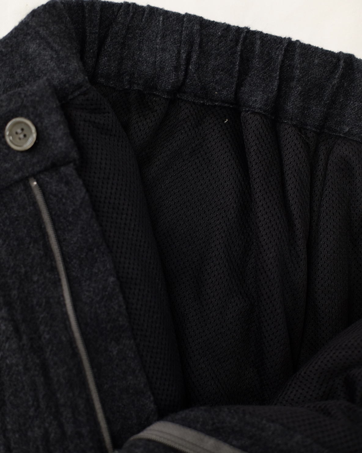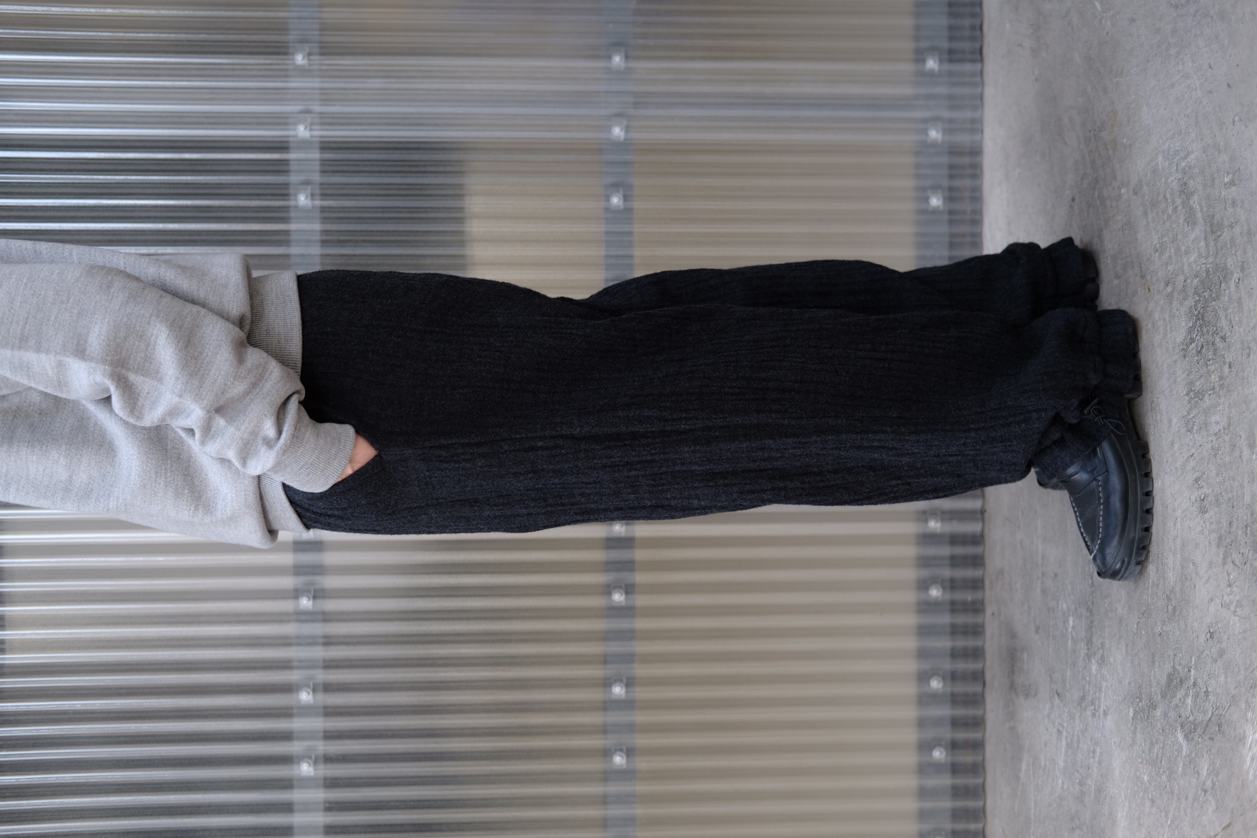 ワイドイージーパンツをベースに使用したトラックパンツ。裾線から少し上に通したスピンドルを絞った際、甘過ぎない程度に裾がフレアになるようにしています。