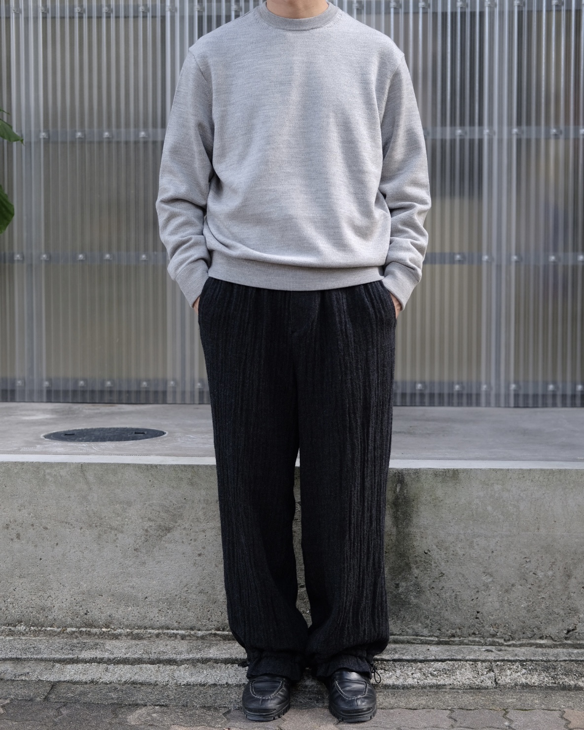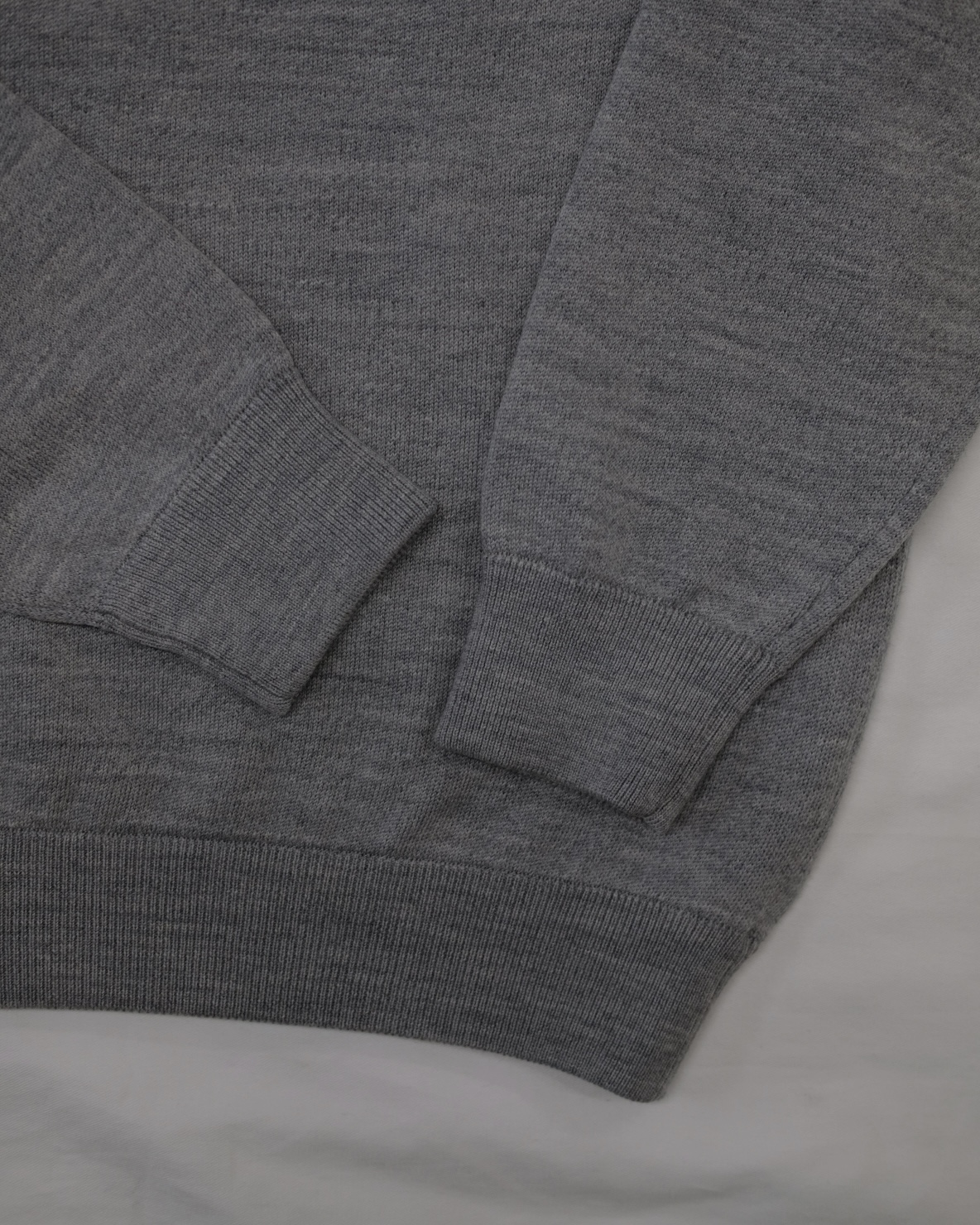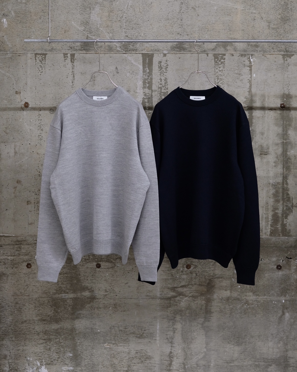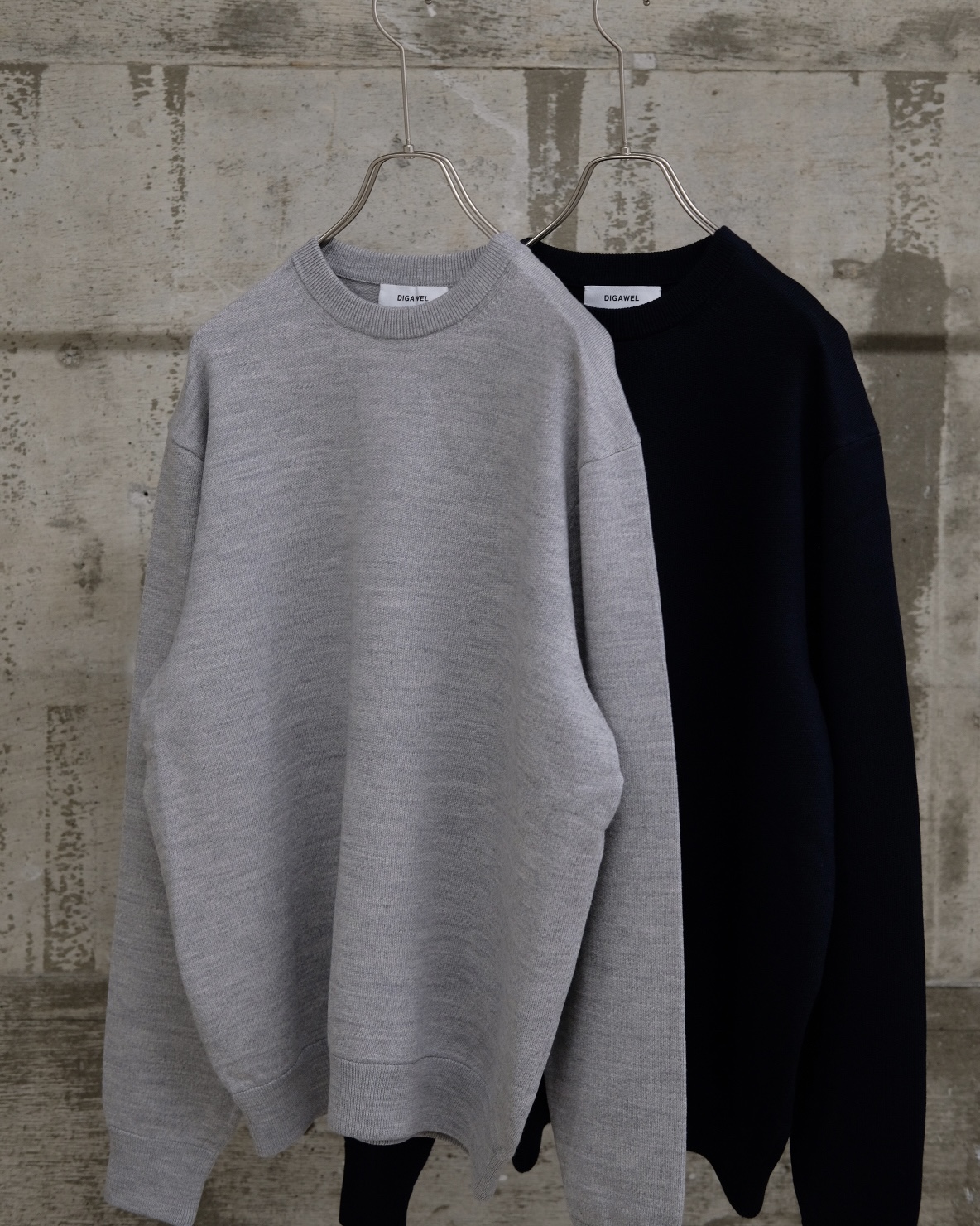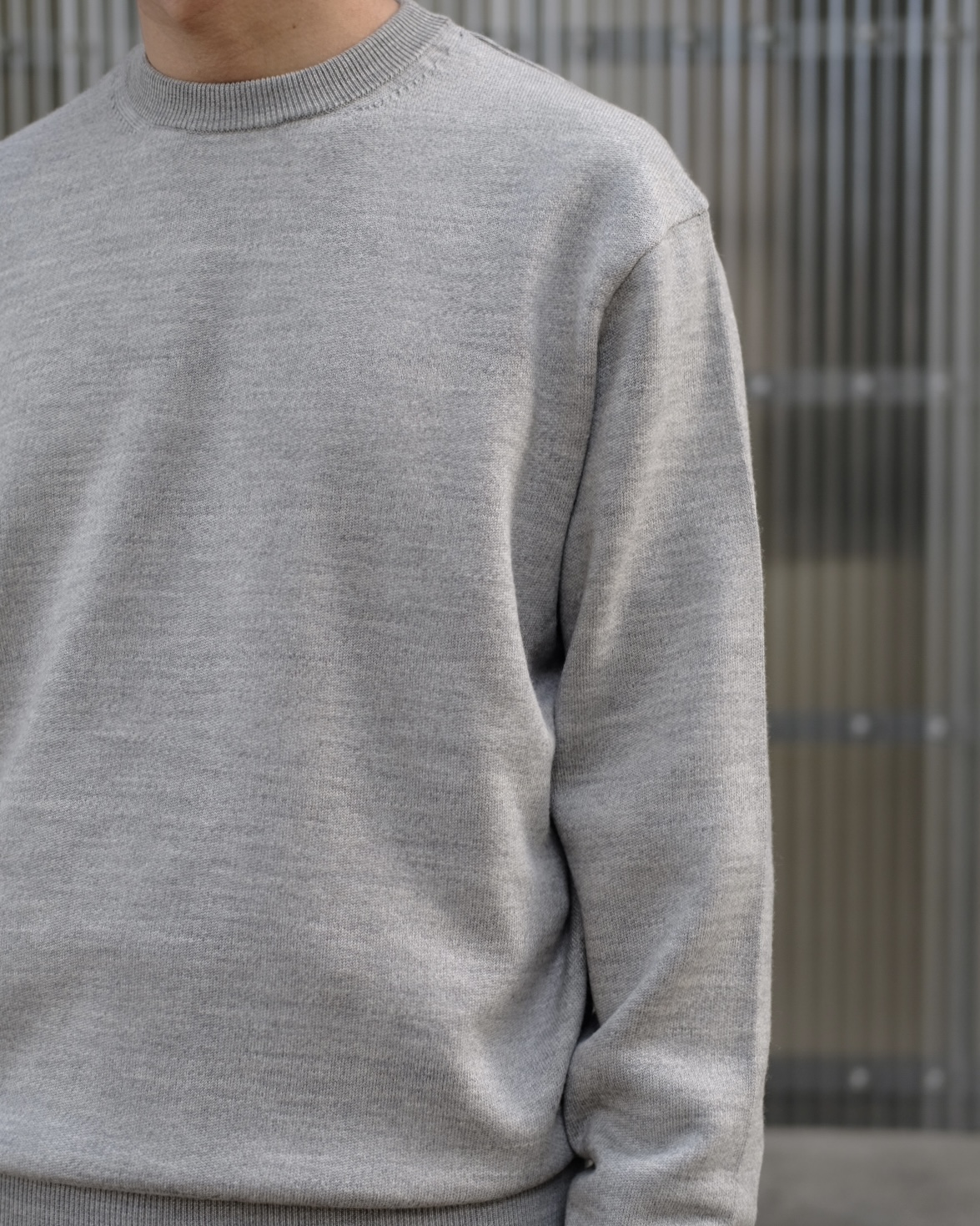 糸の本取りを表裏3本にしてヘビー裏毛のような肉感を出したクルーネックセーター。糸自体も杢を使用してセーターでありながら、スウェットのような表現をしています。