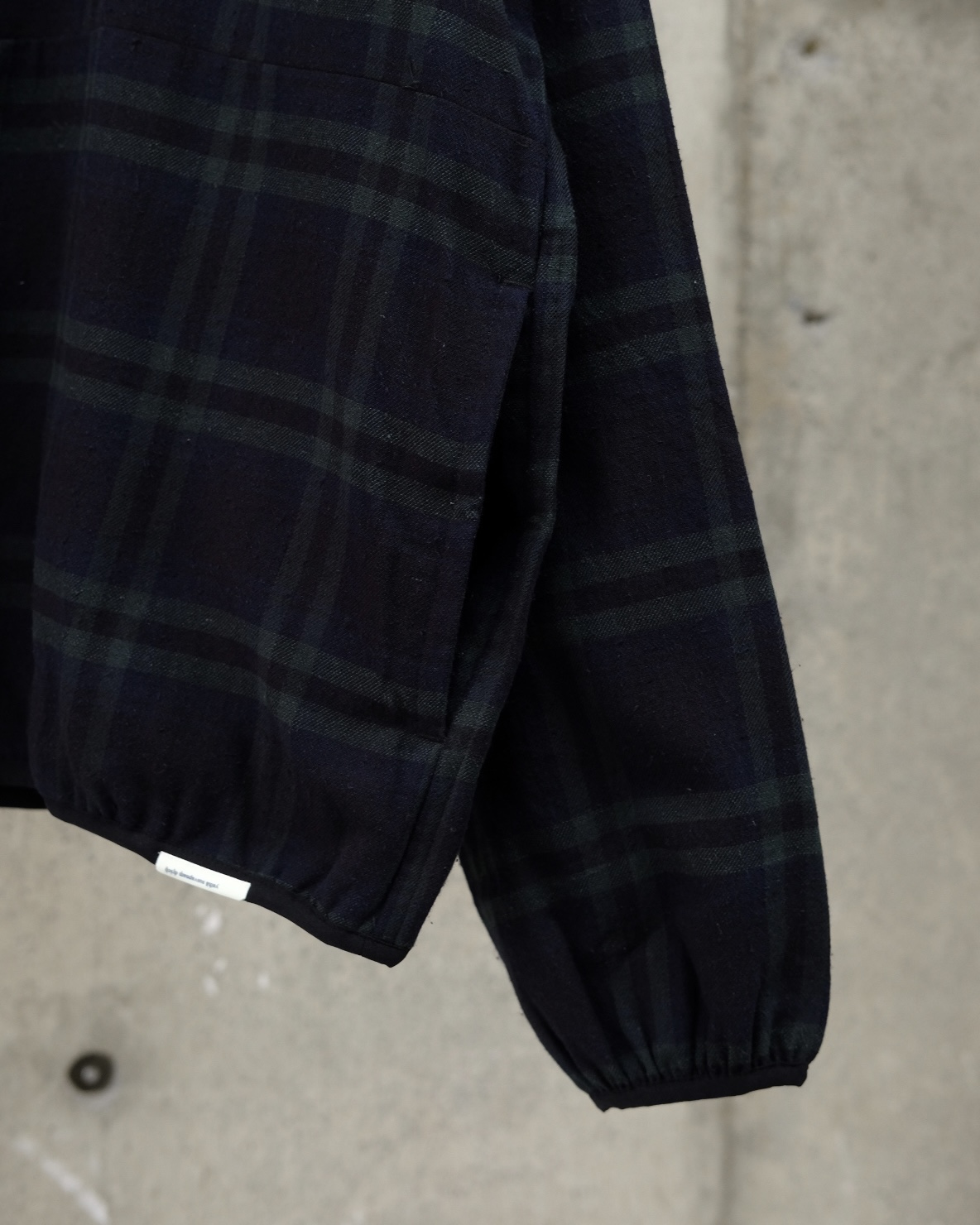 立ち襟デザインですが、ジップを開いて襟を折った状態でも 襟の形が決まる様にスナップボタン付きにしています。サイドポケット付き。