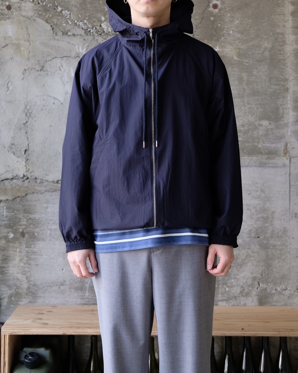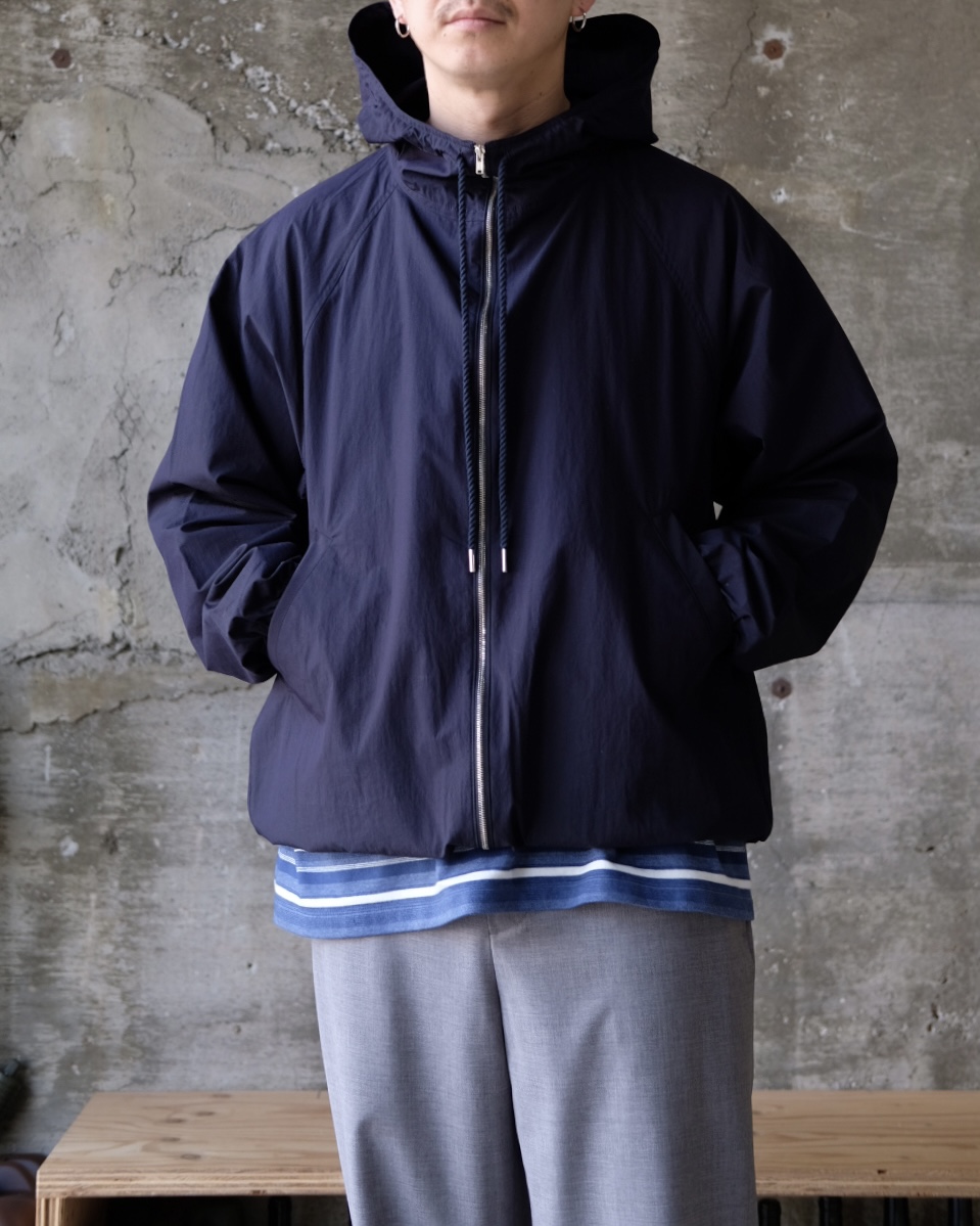 こちらのマウンテンパーカーはコットンとリサイクルナイロンを高密度に織り上げて、ヨコ糸の色を変える事で奥行きのある表情に仕上げています。また繊細なシボ感とコットン100%のドローコードもFUJIらしいクリーンな印象に感じます。