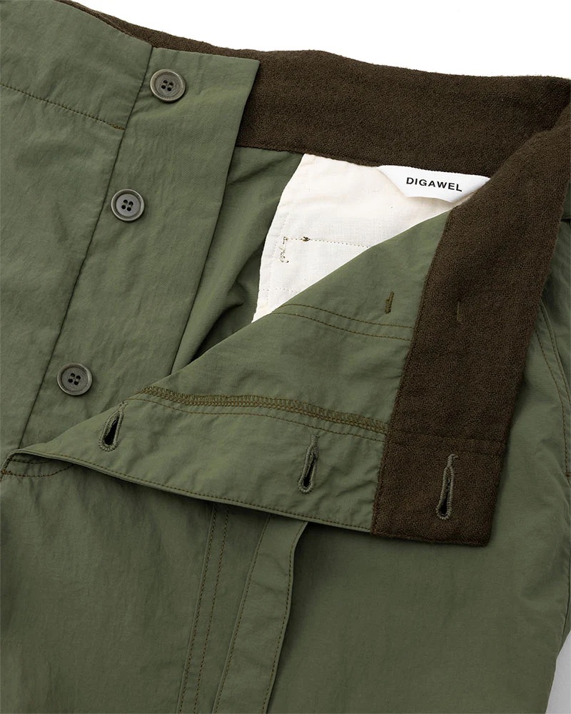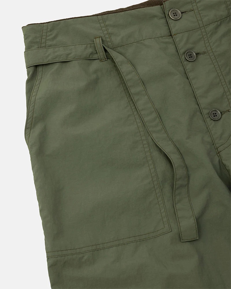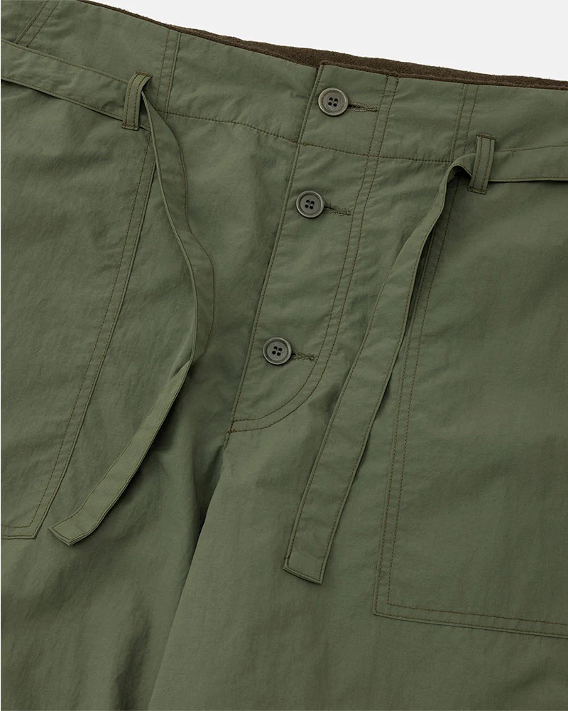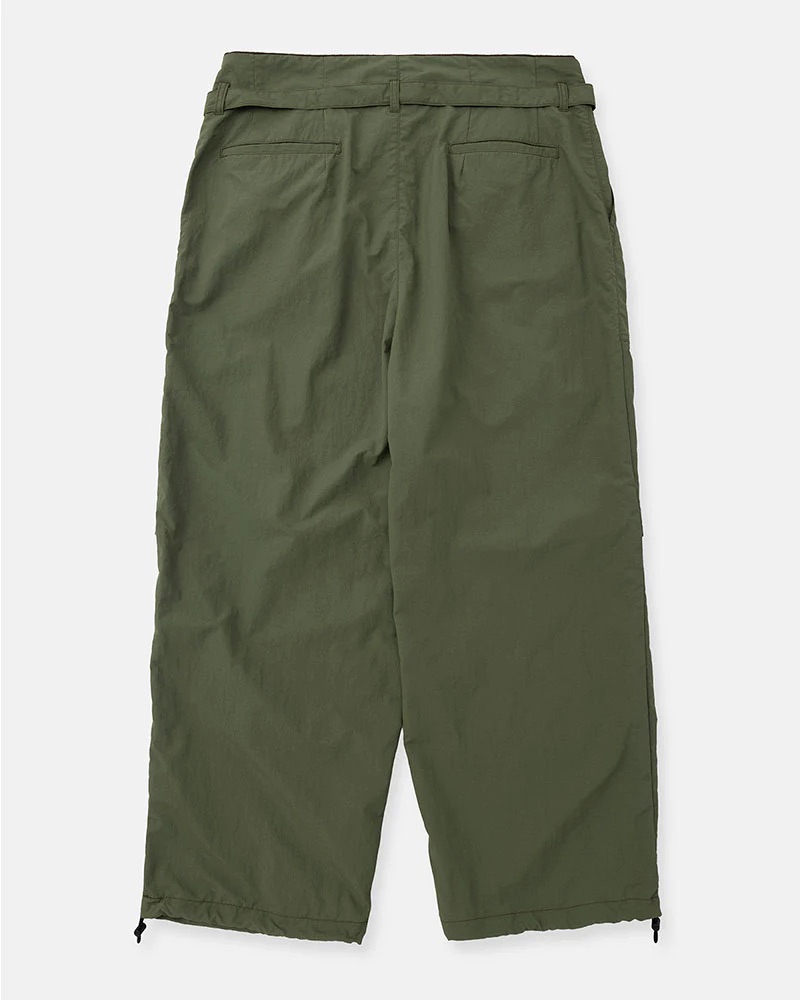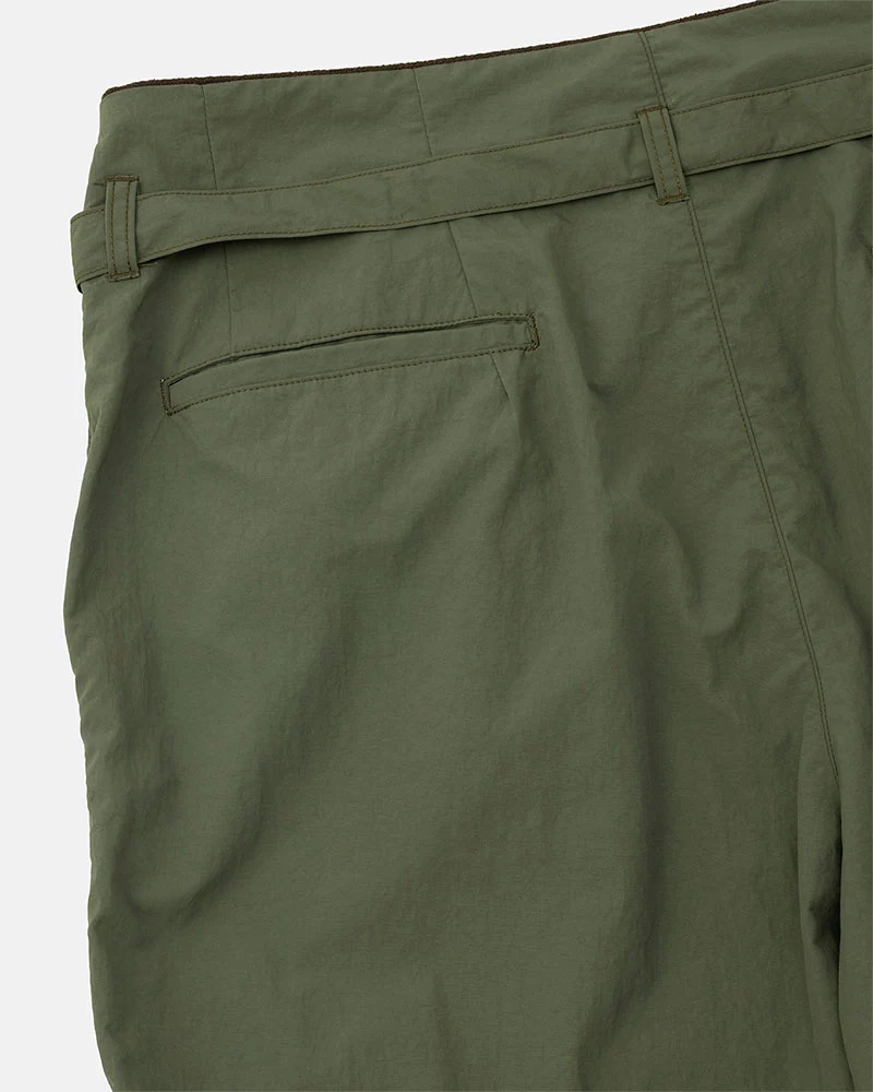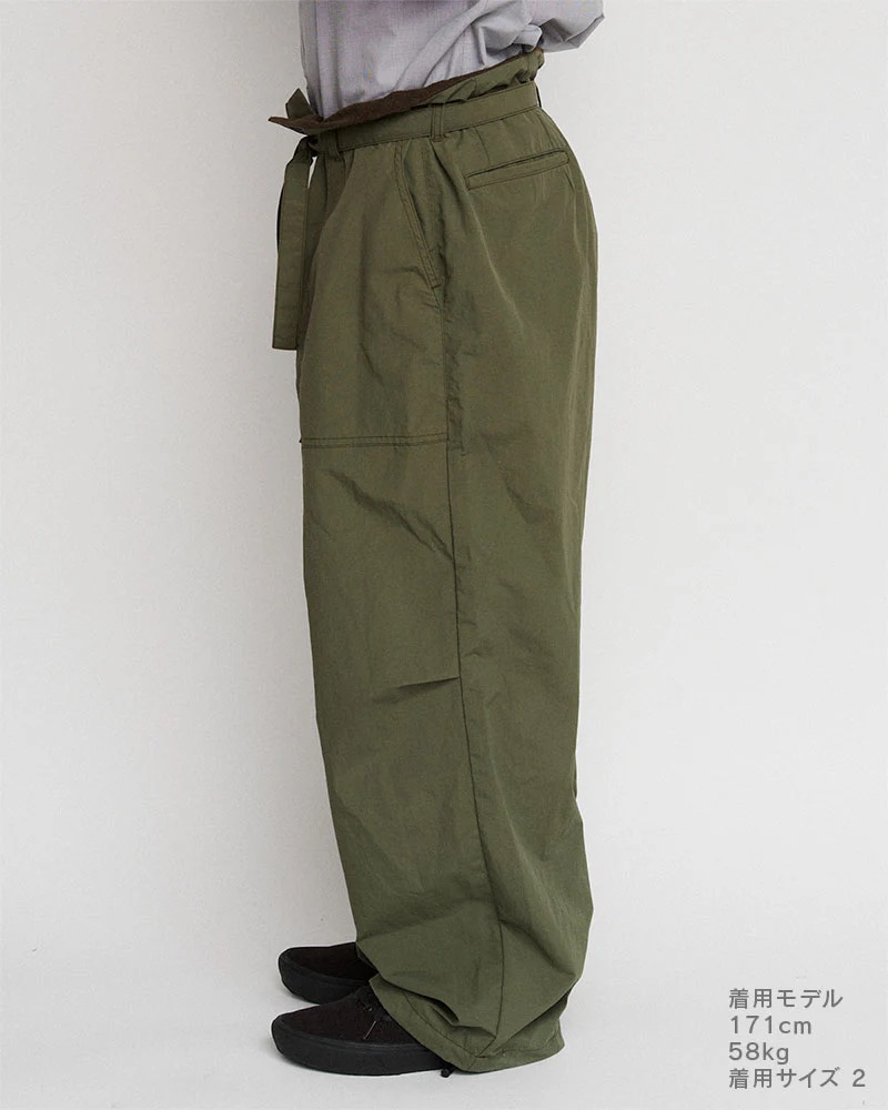 ハイウエストで大きく設定されたウエストを共布ベルトで締めるとパンツ端が反り返りベルト裏の別布が見えるよう設定したパンツ。