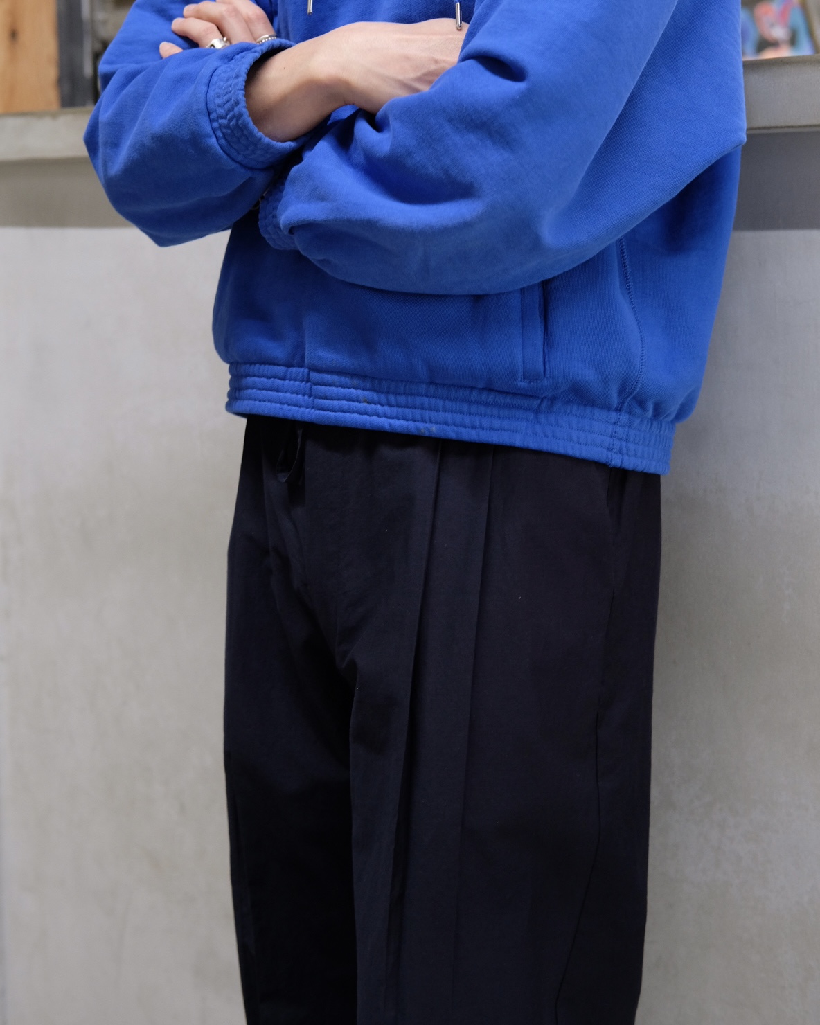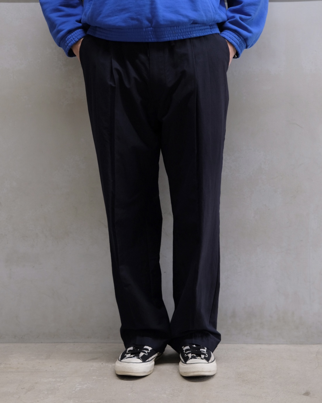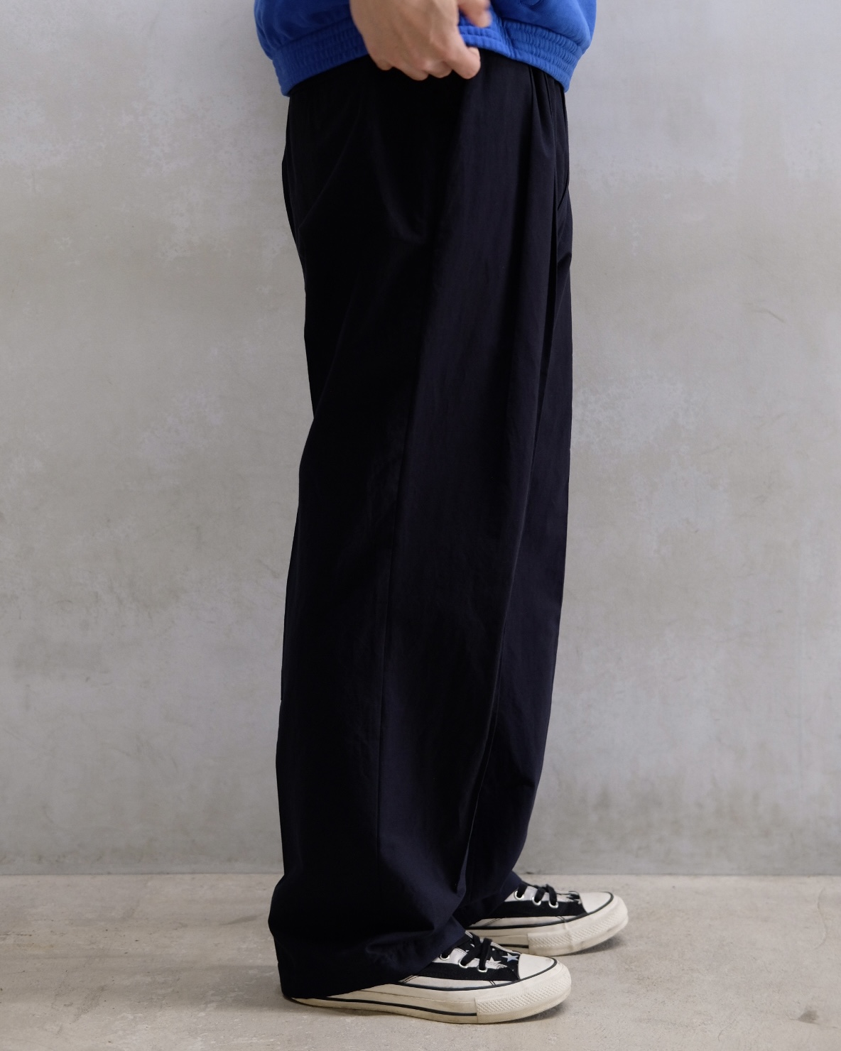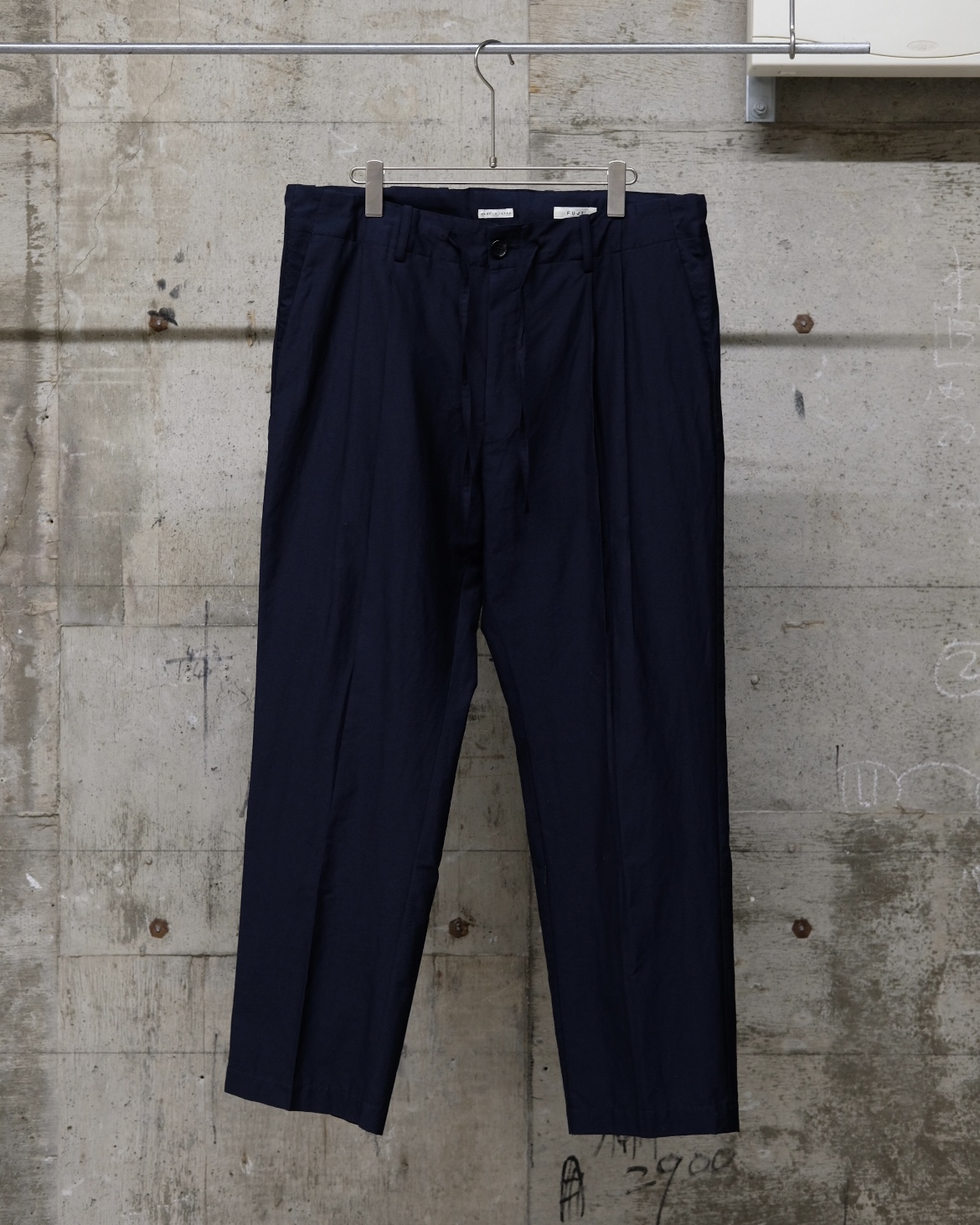 ウエストは付属の共布紐で調整が可能で、前に余る布のたるみがリラックス感ある独特なストレートシルエットを生み出しています。