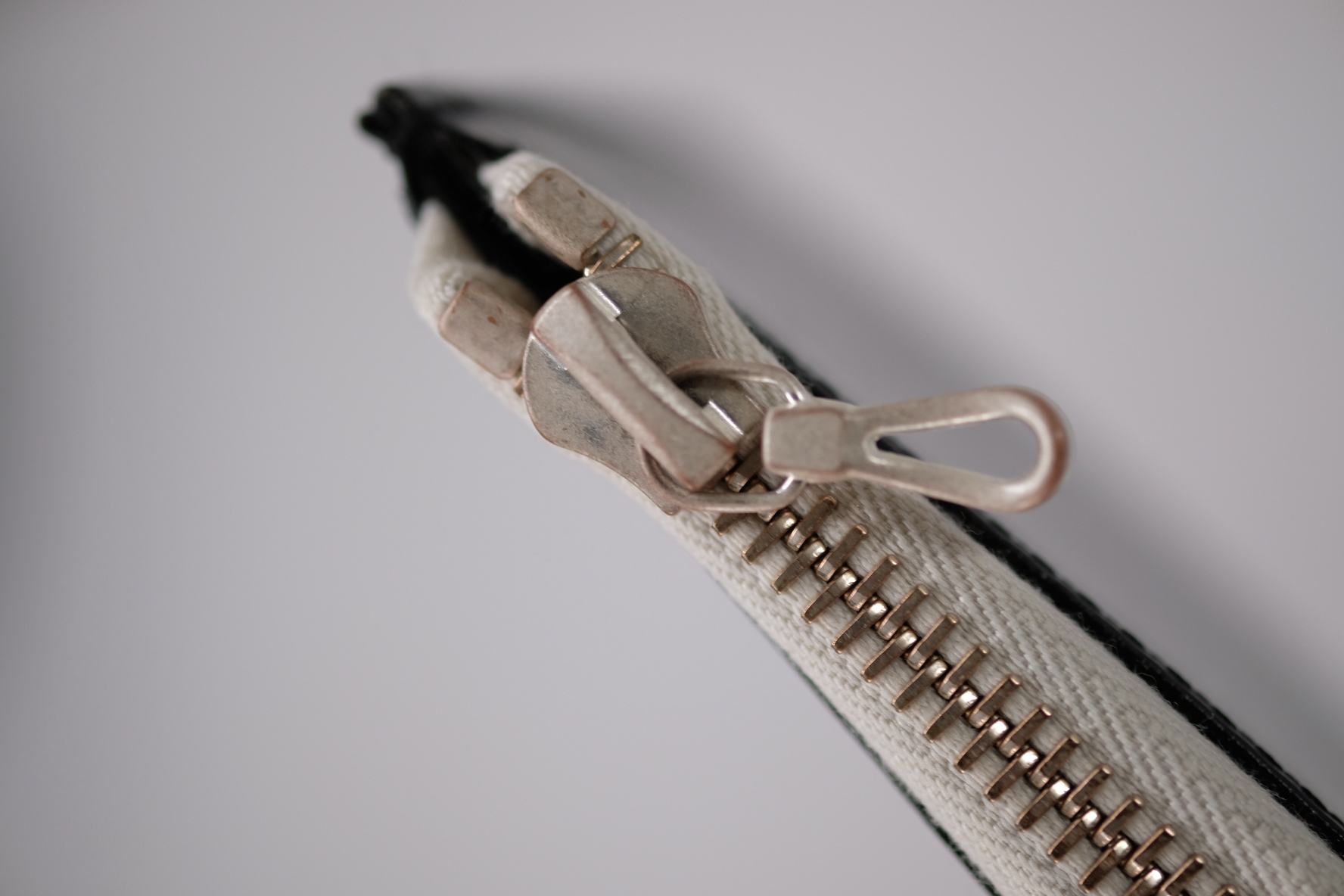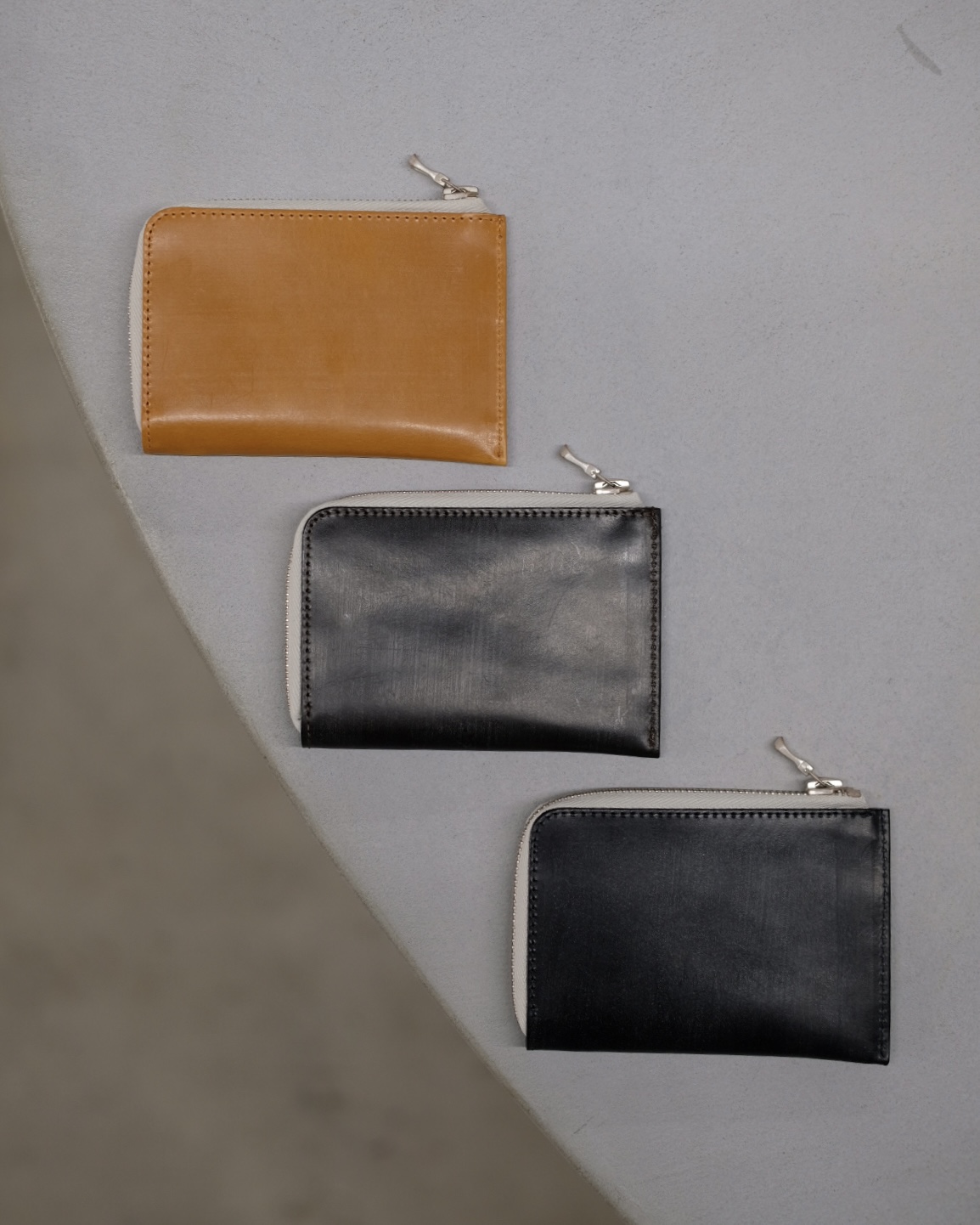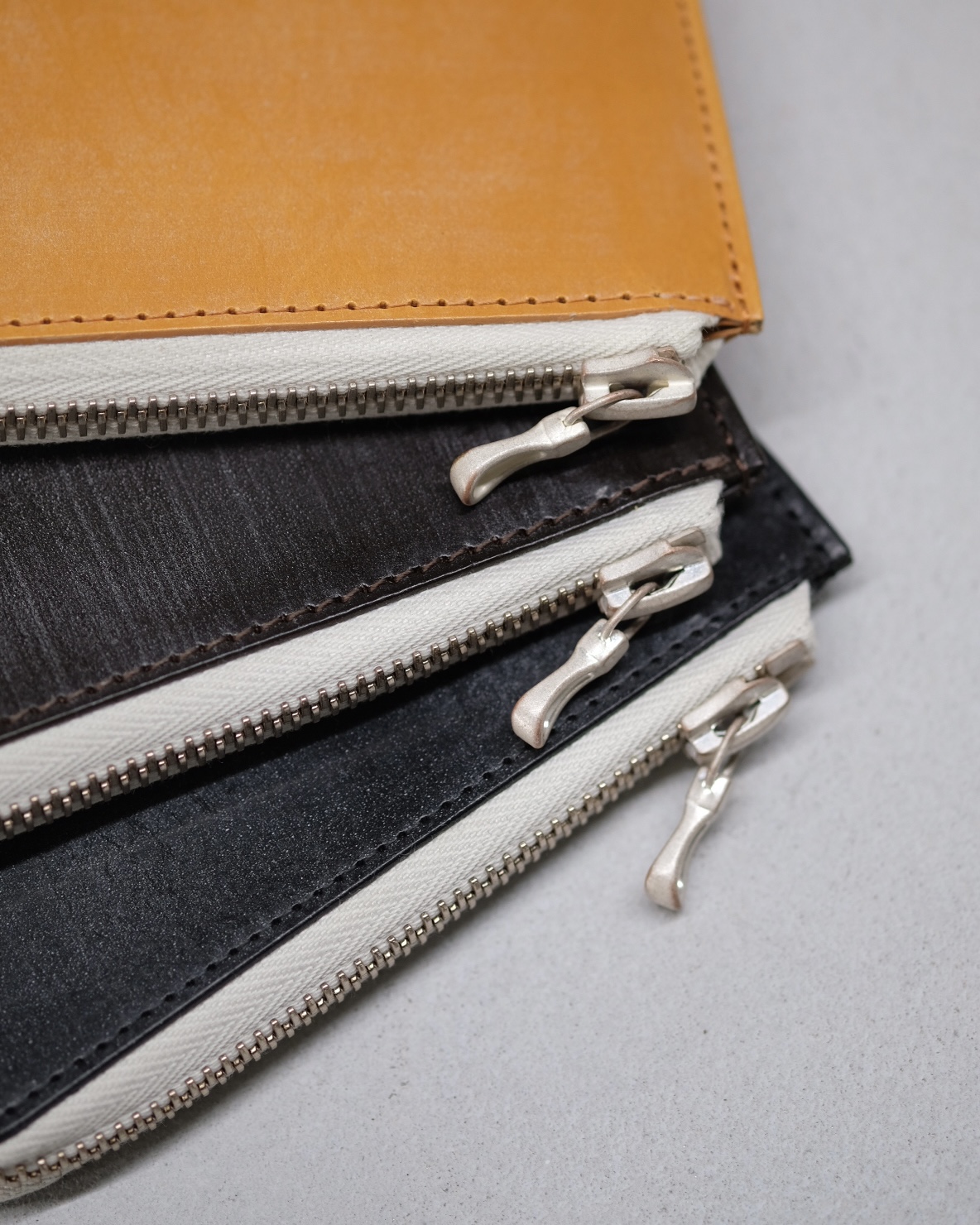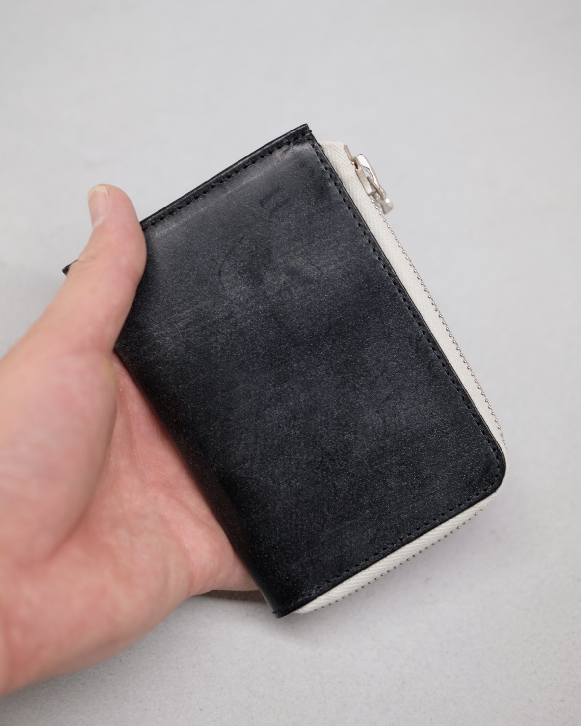 ririファスナーを使用したLジップパース。ブライドルレザー製品の特性である表面の白い粉、斑点の様な「ブルーム」は使用していく内に取れ美しい光沢が出ていきます。