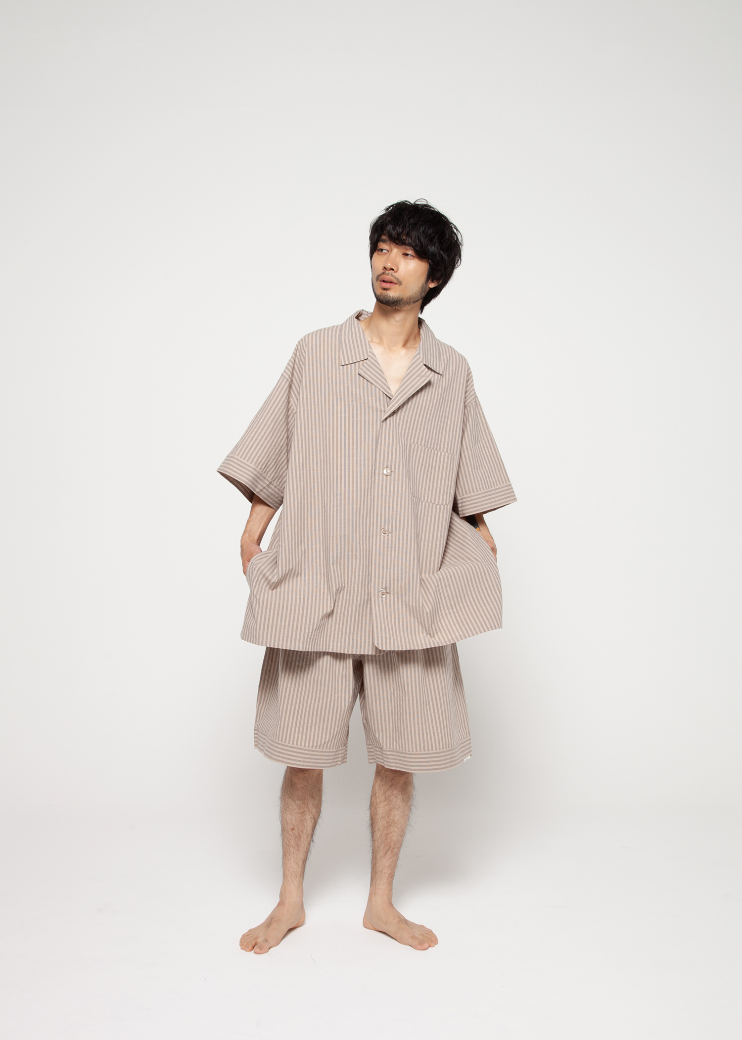 シンプルでトラディショナルなパジャマデザインのオープンカラーシャツ&ビッグハーフパンツ。