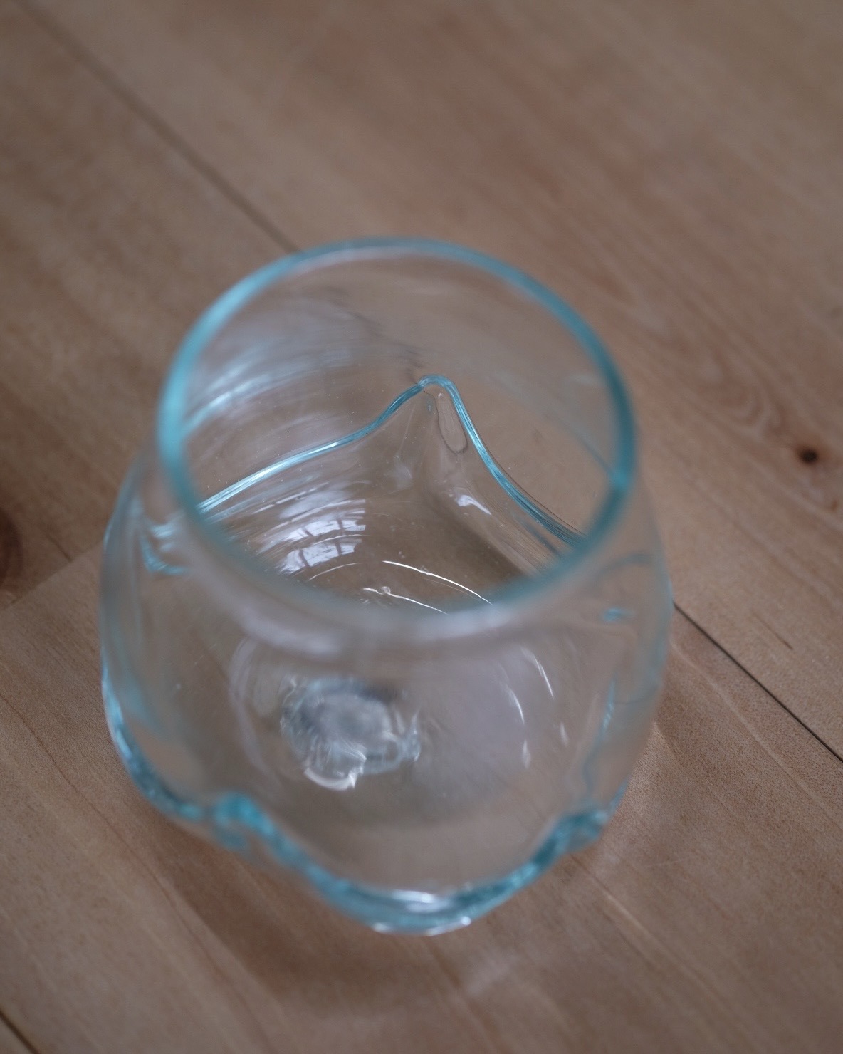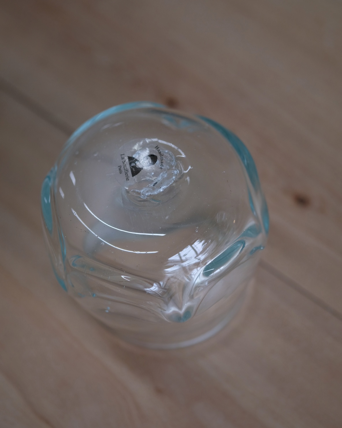 The Nénuphar Eau is without the stem. Easy to hold in the palm of your hand and closer to your heart. The Nénuphar detail along the bottom of the glass is inspired by Monet’s Water lily paintings and creates a unique look to this rather typical glass. The Nénuphar Eau drinking glass is mouth-blown from transparent recycled glass by our master glassblowers.