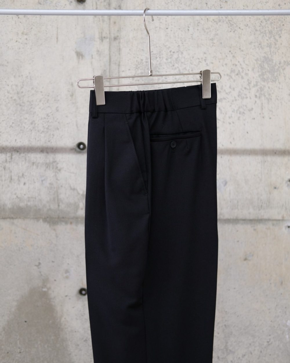 ここ数シーズン続けているセンタープレスの入ったインタックスラックスです。ウエストのサイドにはゴムが配されたフィッティングの高さも魅力。