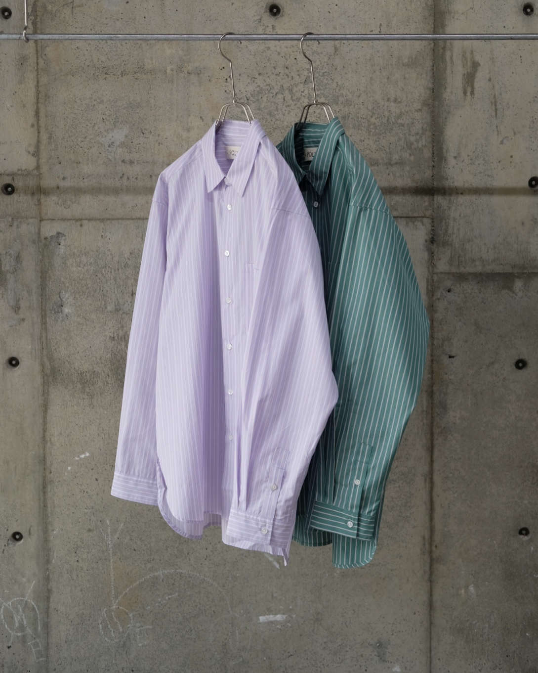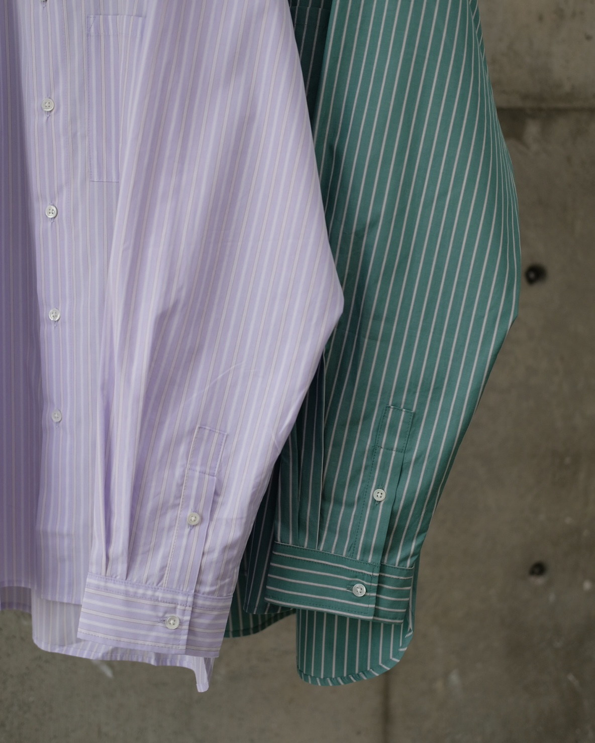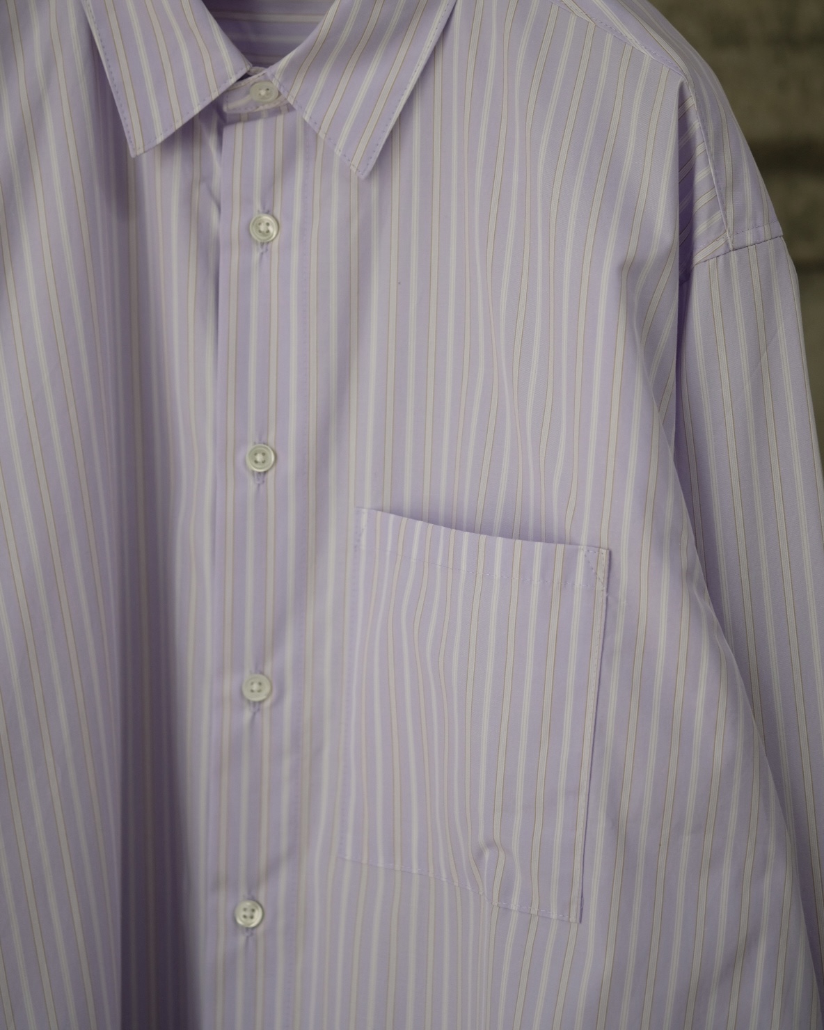 100番双糸を高密度で織り上げたストライプブロード生地を使用したクラッシックなポケット付きシャツ。